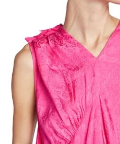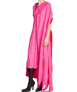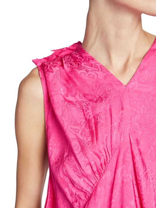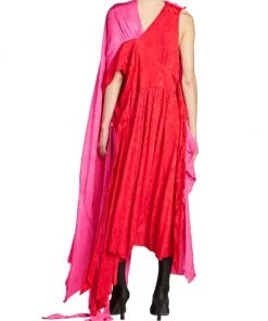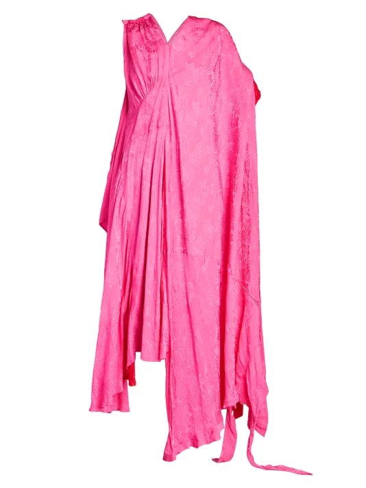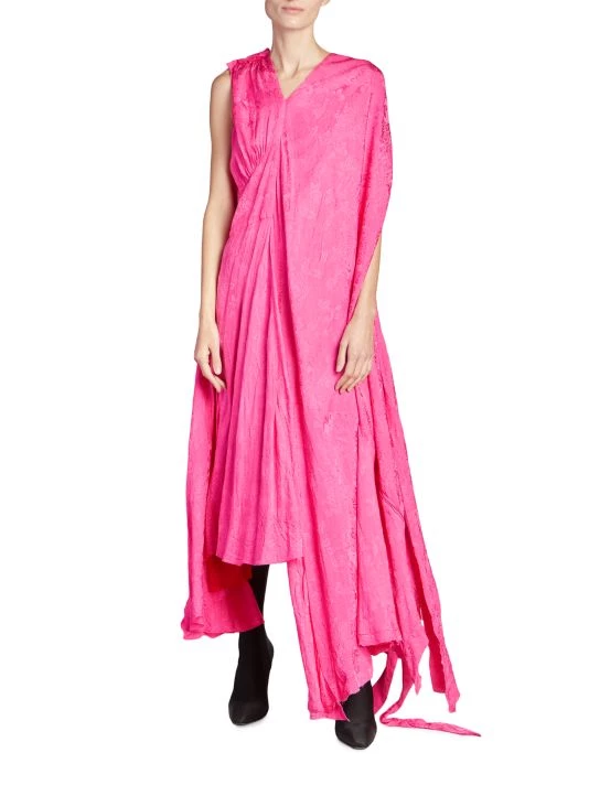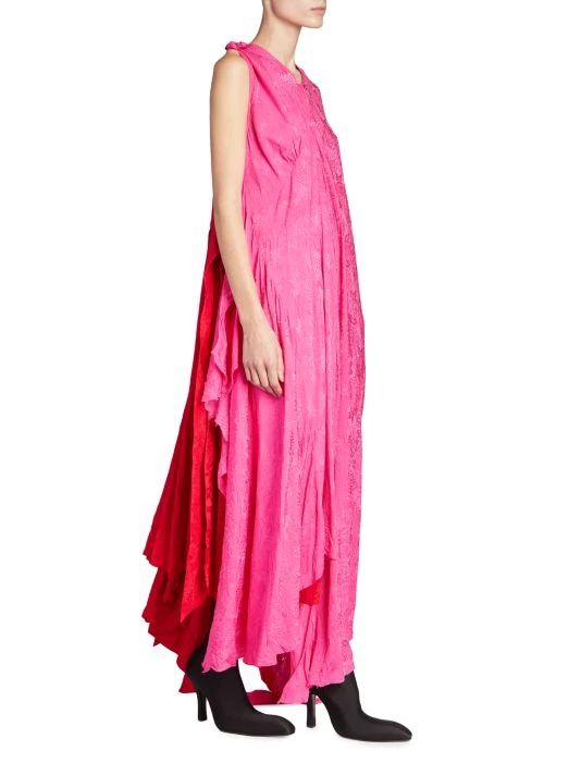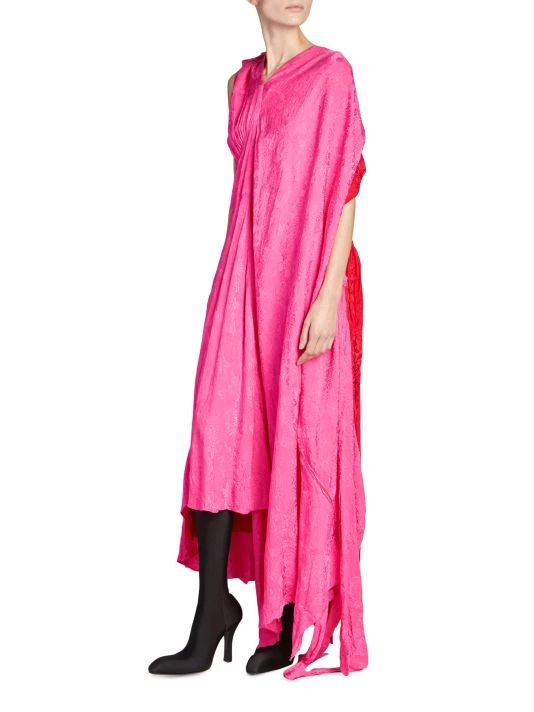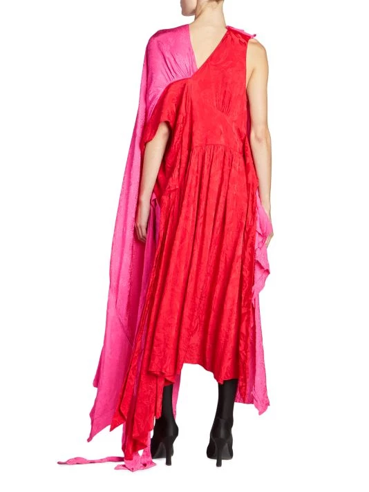 This asymmetric colorblocked maxi dress is complete with lustrous jacquard floral and logo prints.