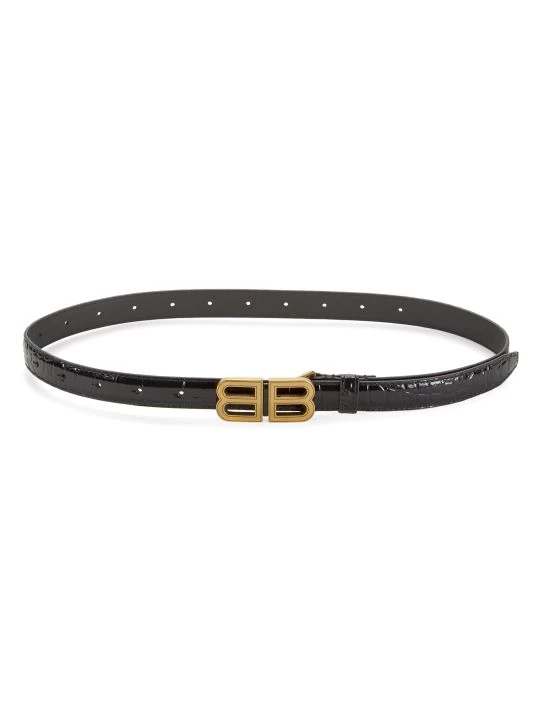 Balenciaga’s Hourglass belt is made in Italy of crocodile embossed leather with a polished finish. This piece is highlighted with the house’s signature BB logo buckle.