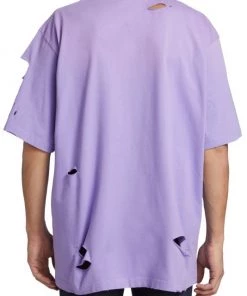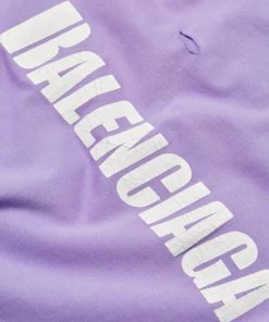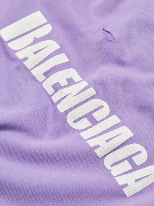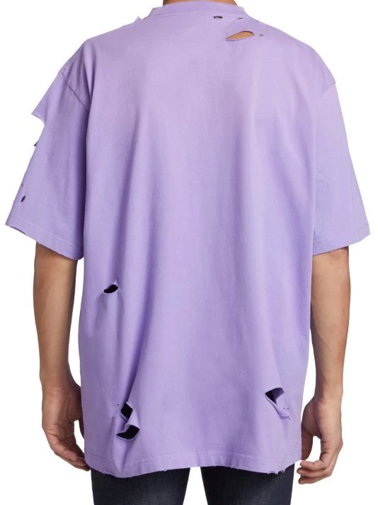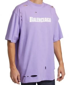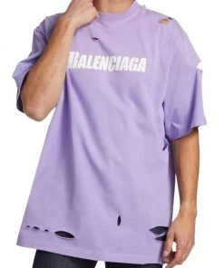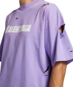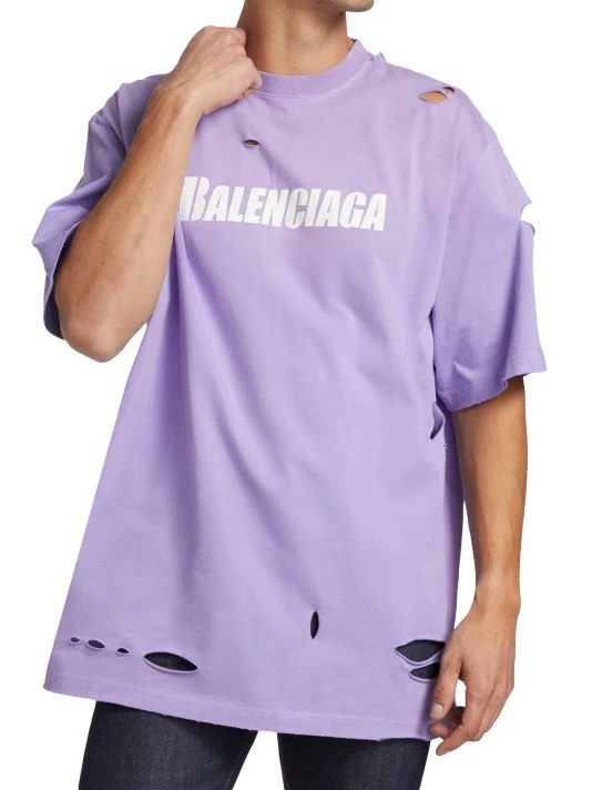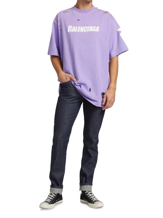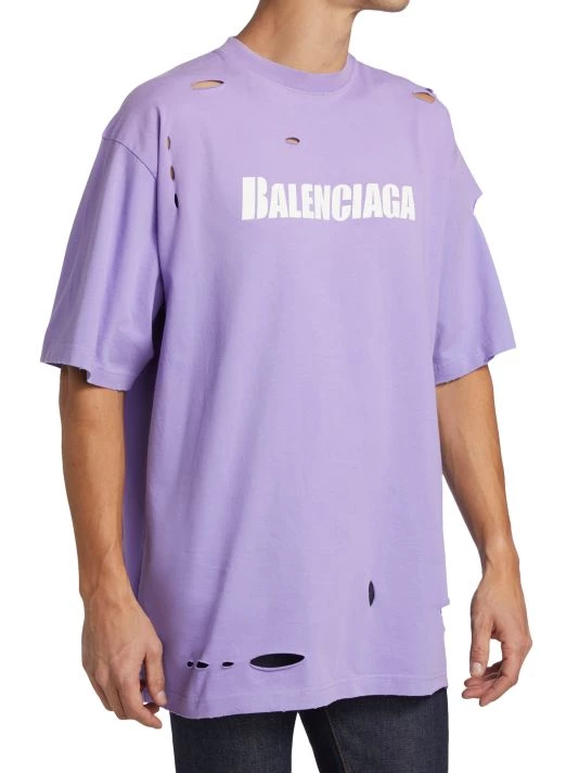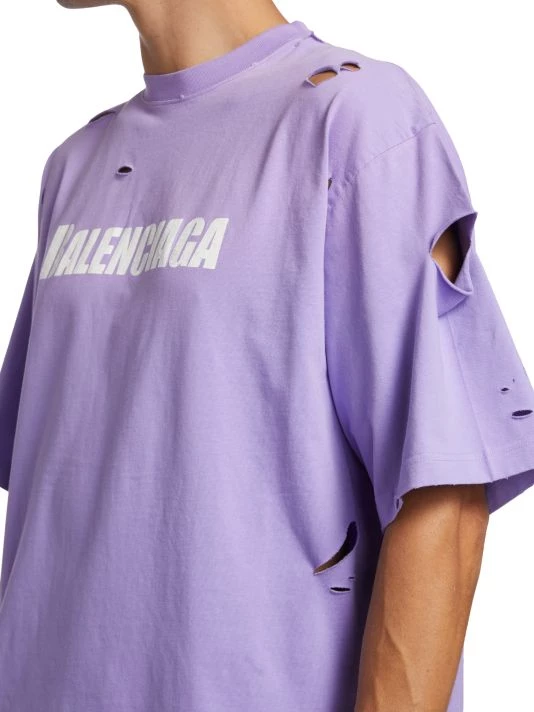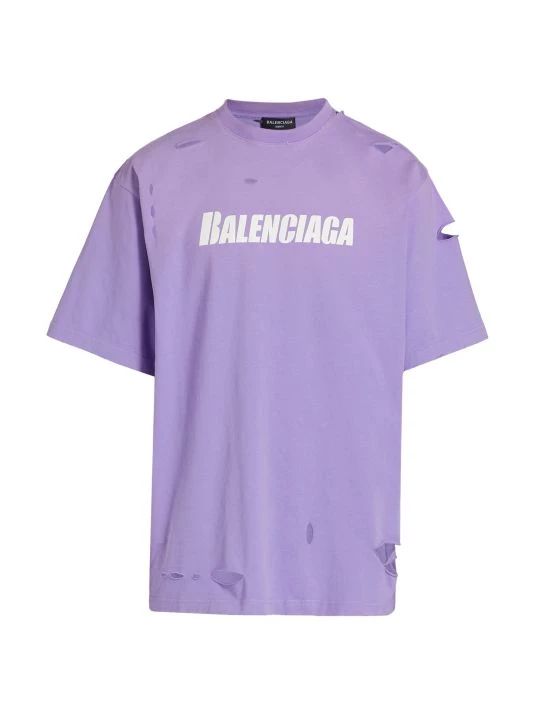 Crafted of 100% cotton, this crewneck T-shirt is printed with a Balenciaga logo on the chest and features distressed detailing throughout.