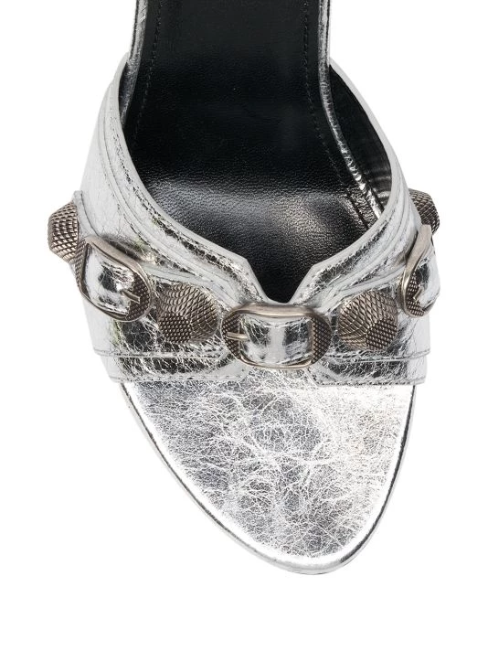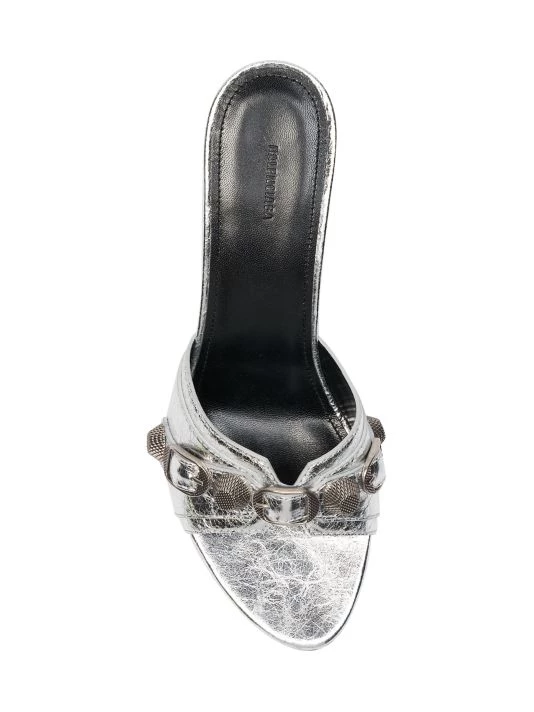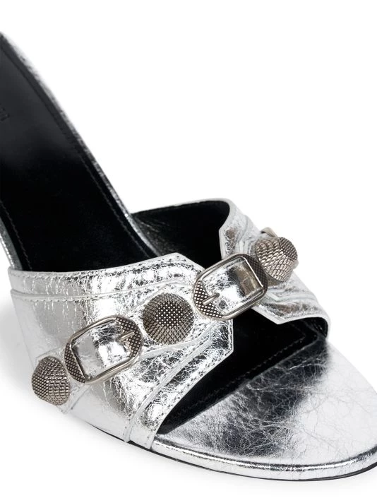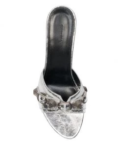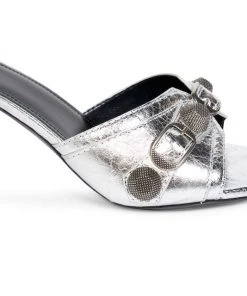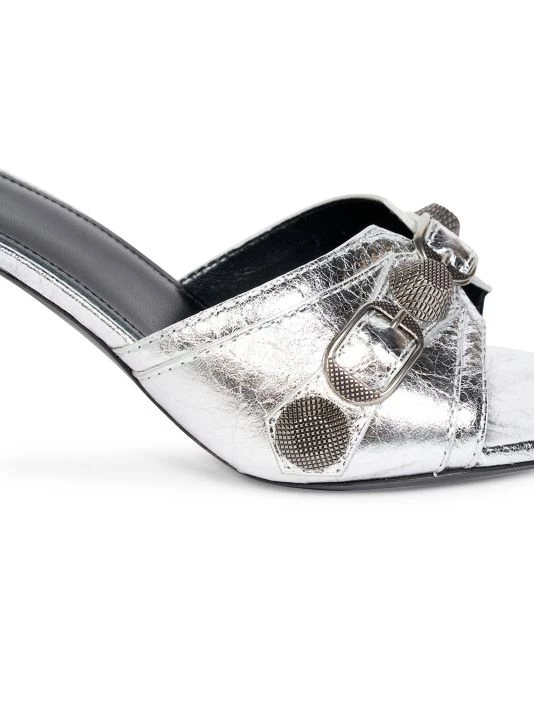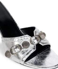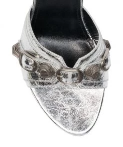 Balenciaga’s Cagole sandals are inspired by the iconic Le Cagole handbag. Made in Italy, these crinkled metallic leather mules are styled with signature buckles and studs at the vamp.