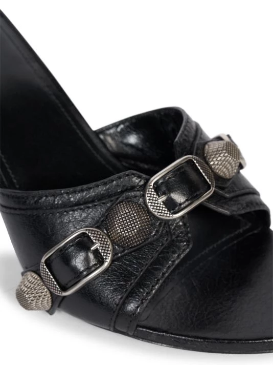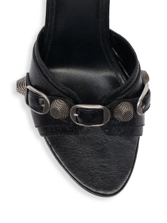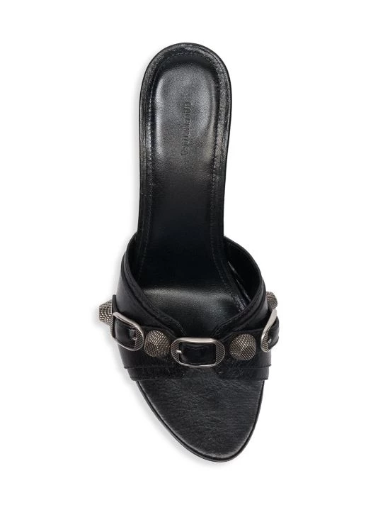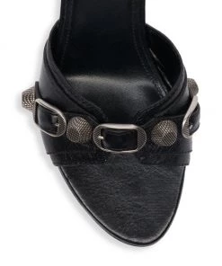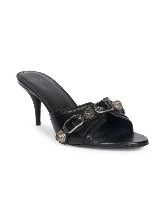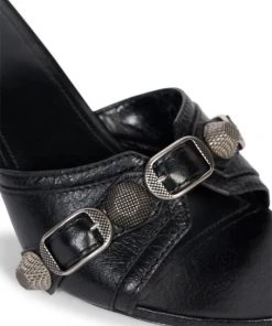 Balenciaga’s Cagole sandals are inspired by the iconic Le Cagole handbag. These leather mules are adorned with aged silvertone hardware at the vamp.