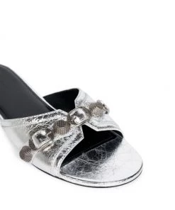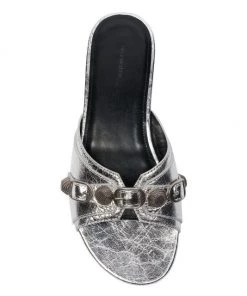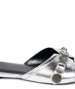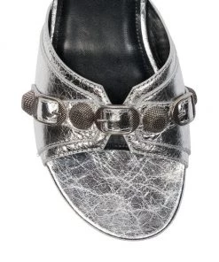 Balenciaga’s Cagole sandals are inspired by the iconic Le Cagole handbag. Made in Italy, these crinkled metallic leather slides are styled with signature buckles and studs at the vamp.