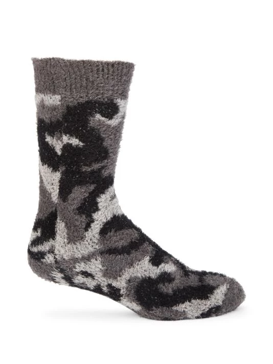 A pair of fuzzy socks with a monochrome camouflage pattern.