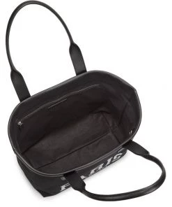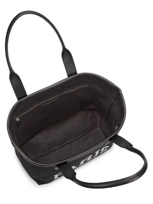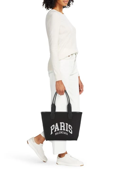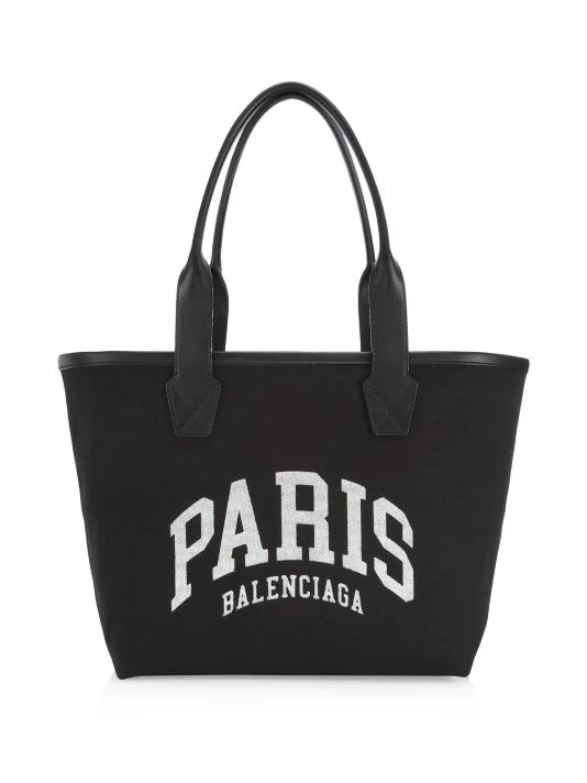 Balenciaga’s canvas beach tote is enhanced with leather trim and a printed logo motif at the front.