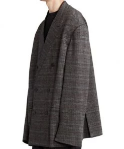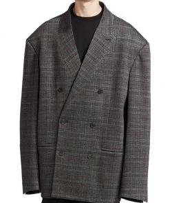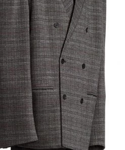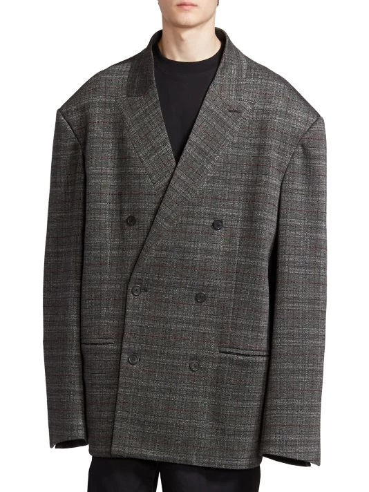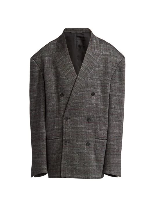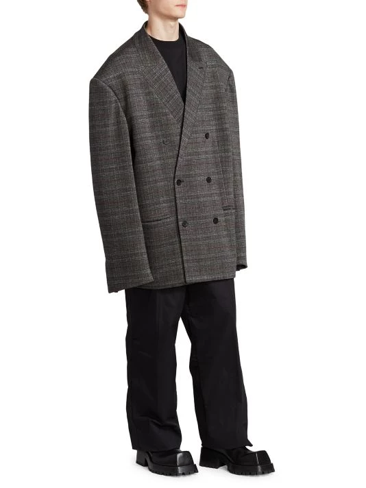 Balenciaga takes on a cyber-glam aesthetic, working lavish details like sequins and boas into baggy, oversized garments. Perfected by Creative Director Demna Gvasalia, this collection encompasses over-the-top platforms, pleated dresses, and strappy studded jeans. This viscose-blend double-breasted blazer features a checkered patteren and sleek side welt pockets.