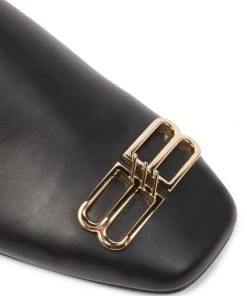 These Balenciaga mules, crafted of smooth calfskin leather, feature a rounded toe adorned with a goldtone logo appliqué.