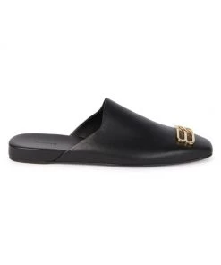 These Balenciaga mules, crafted of smooth calfskin leather, feature a rounded toe adorned with a goldtone logo appliqué.