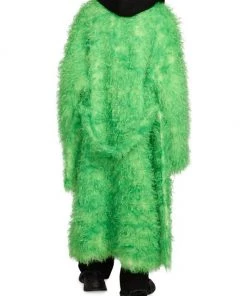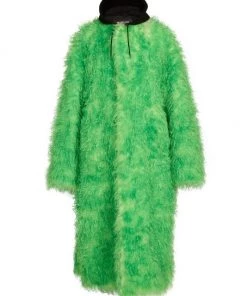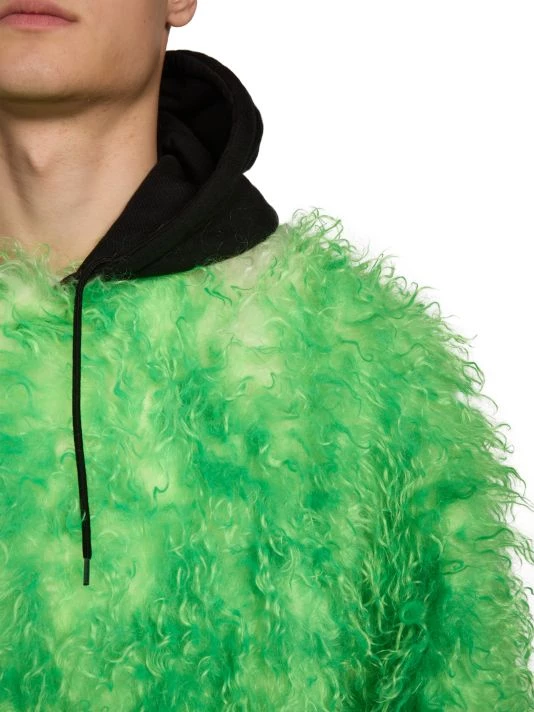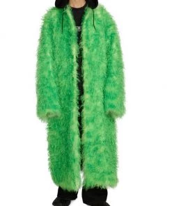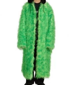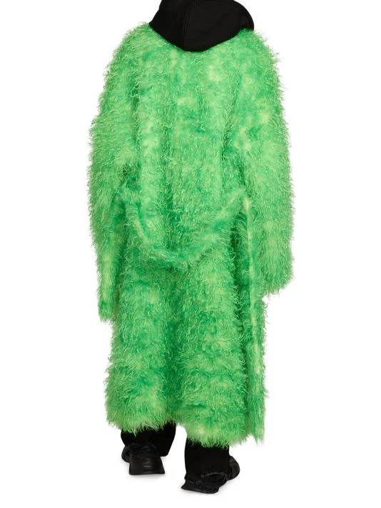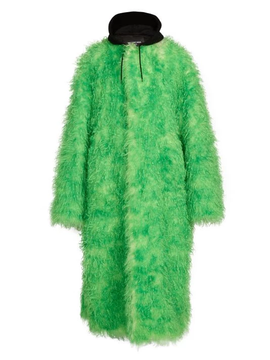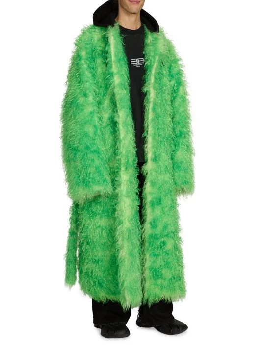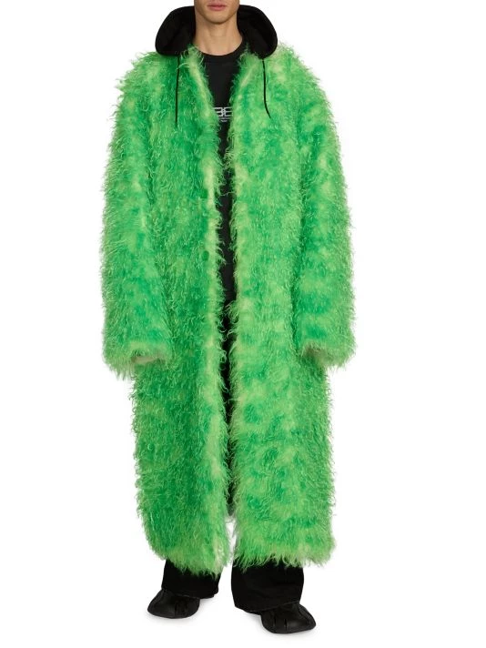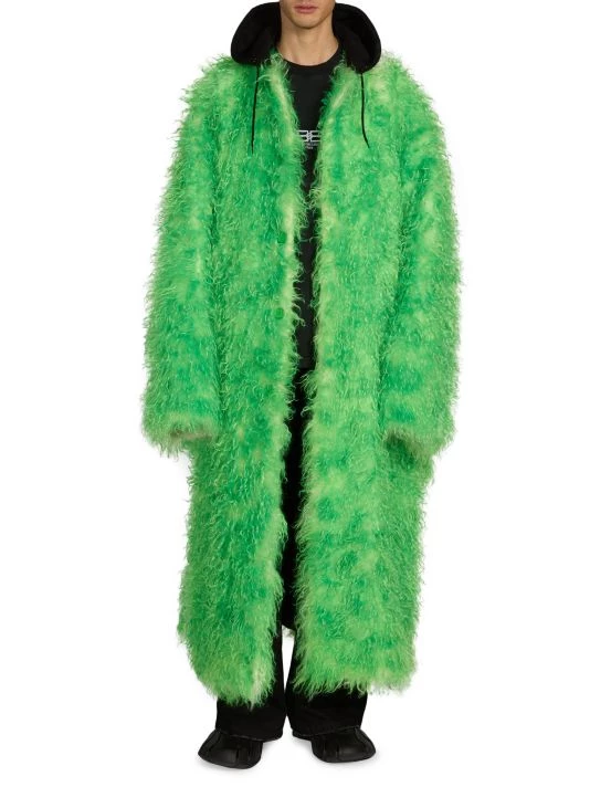 This faux fur coat from Balenciaga features a drawstring hood and an ankle-length silhouette.