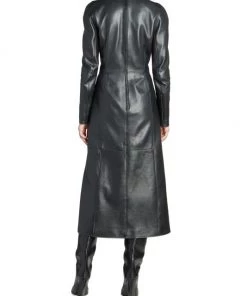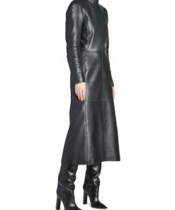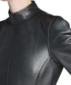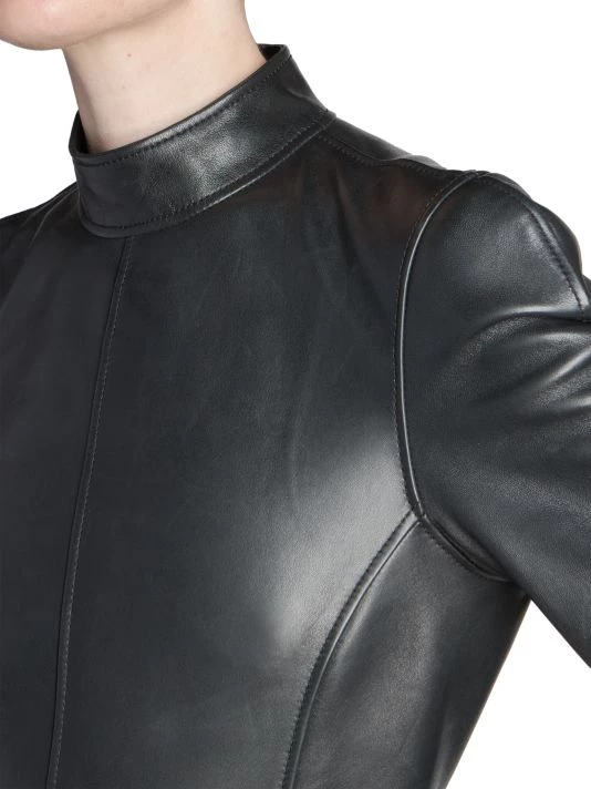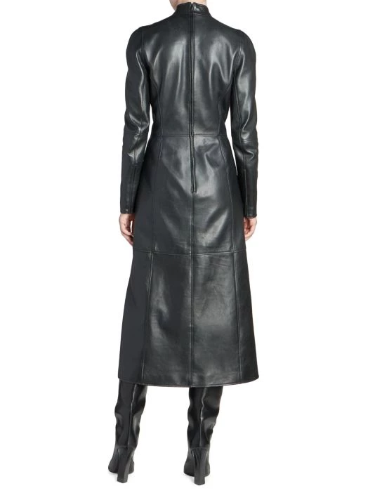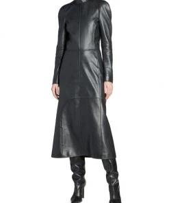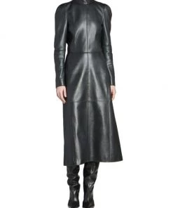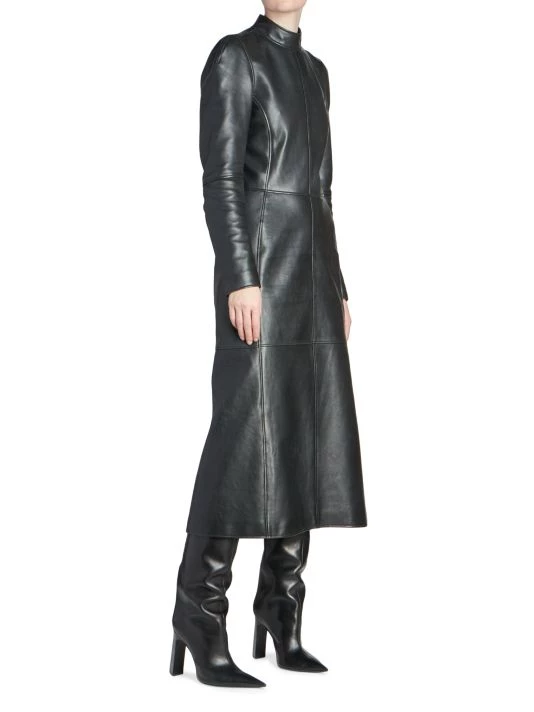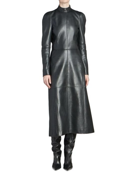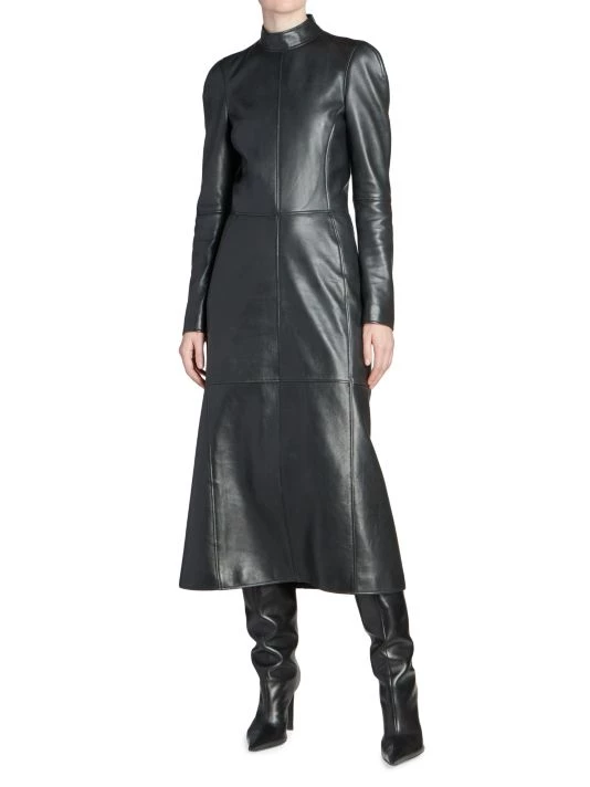 Balenciaga takes on a cyber-glam aesthetic, working lavish details like sequins and boas into baggy, oversized garments. Perfected by Creative Director Demna Gvasalia, this collection encompasses over-the-top platforms, pleated dresses, and strappy studded jeans. Lustrous leather midi-dress with structured seaming and playful zip cuffs.