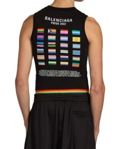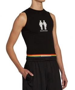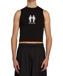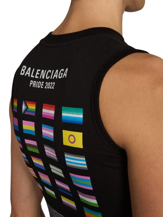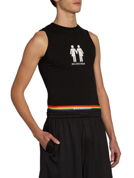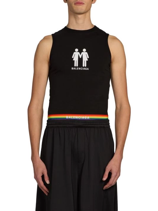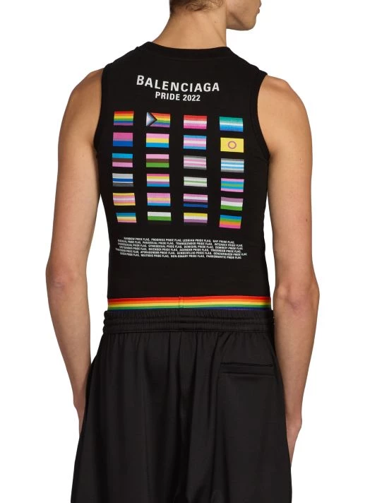 Cut for a snug fit, this tank top features an all-gender bathroom symbol on the front and twenty-four Pride flags on the back.