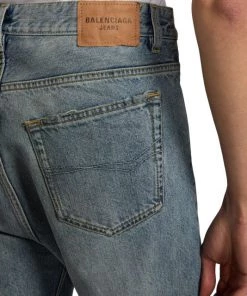 Balenciaga’s jeans feature a flared silhouette and sport a classic five-pocket style.