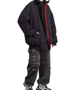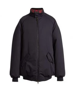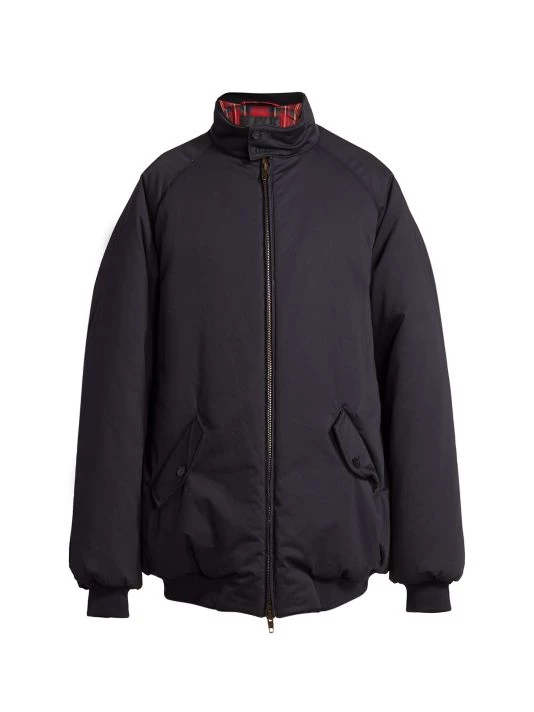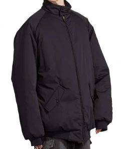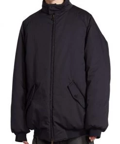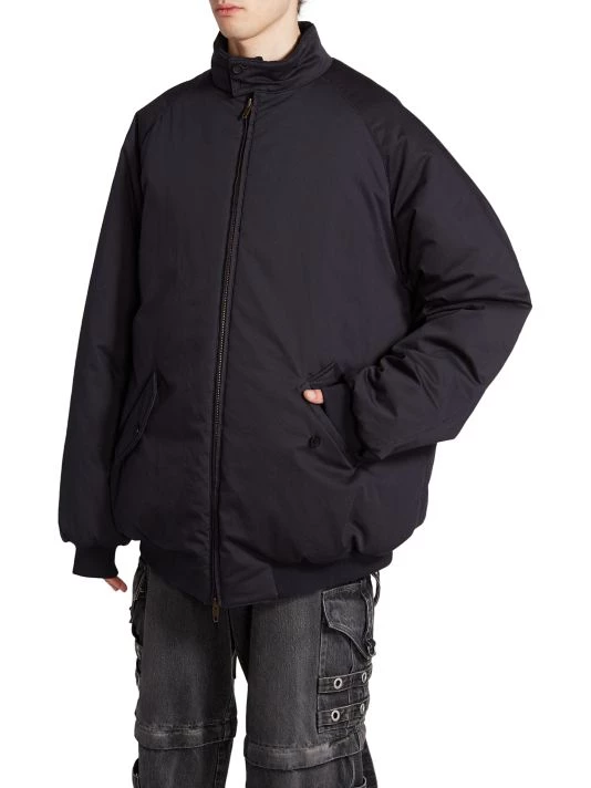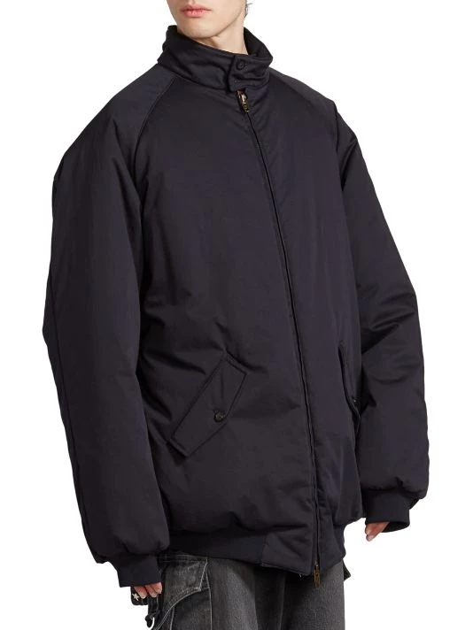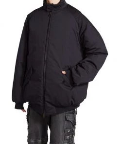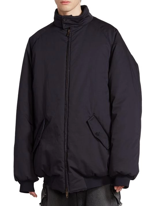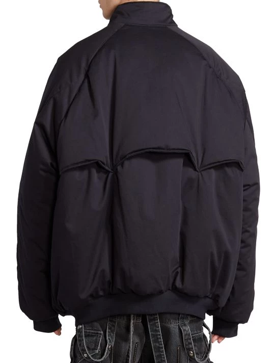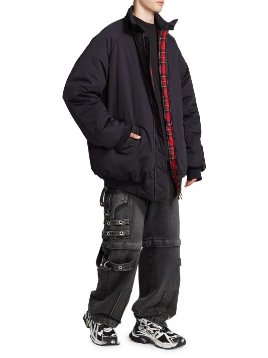 Balenciaga takes on a cyber-glam aesthetic, working lavish details like sequins and boas into baggy, oversized garments. Perfected by Creative Director Demna Gvasalia, this collection encompasses over-the-top platforms, pleated dresses, and strappy studded jeans. This bomber jacket features buttoned flap pockets and a sleek exterior made of cotton.