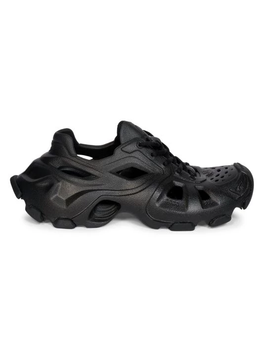 Balenciaga’s HD sneakers rest on a chunky bulldozer sole. Crafted in a rubberized construction, this pair is detailed with cutouts and branded accents.