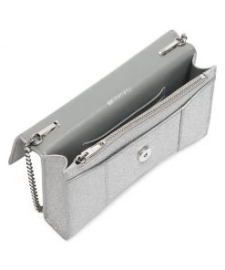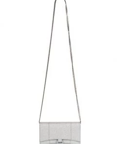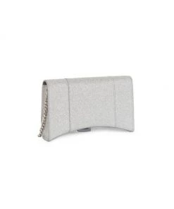 From the Hourglass Collection. Designed in an iconic sculptural silhouette, Balenciaga’s wallet is crafted of gleaming glitter with signature logo-engraved B hardware. This Italian-made piece is accompanied by a sleek chain strap.