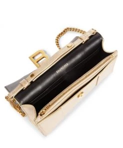 From the Hourglass Collection. Designed in an iconic sculptural silhouette, Balenciaga’s wallet is crafted of eye-catching metallic leather adorned with logo-engraved B hardware. This Italian-made piece is accompanied by a sleek chain strap.