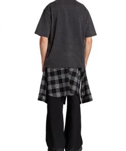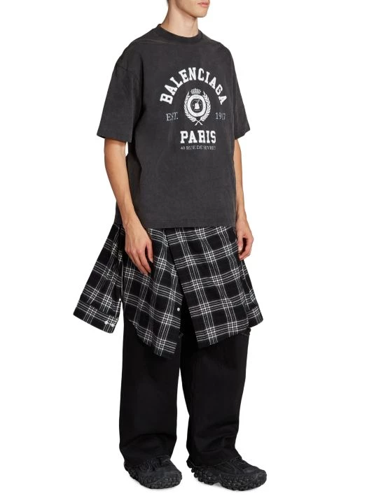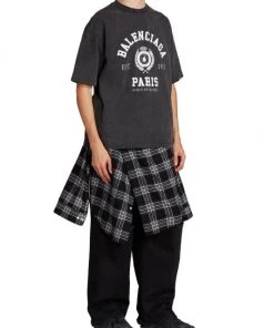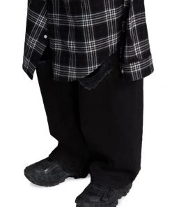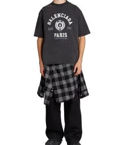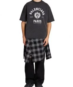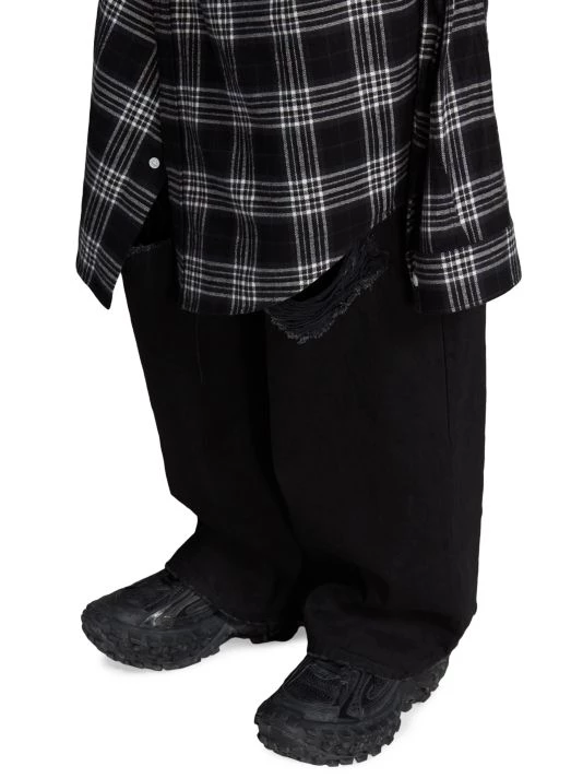 In an absurdist exploration of the line between fashion and entertainment, Balenciaga’s Creative Director Demna juxtaposes boastful glamour with a dystopian edge. Oversized gowns, sequin column dresses, boas, and sleek pleats meet a Y2K, cyber-goth approach to tailoring, baggy denim, and layered knits. Crafted of 100% cotton featuring a two-tone plaid, this knotted shirt is designed to be worn at the waist.