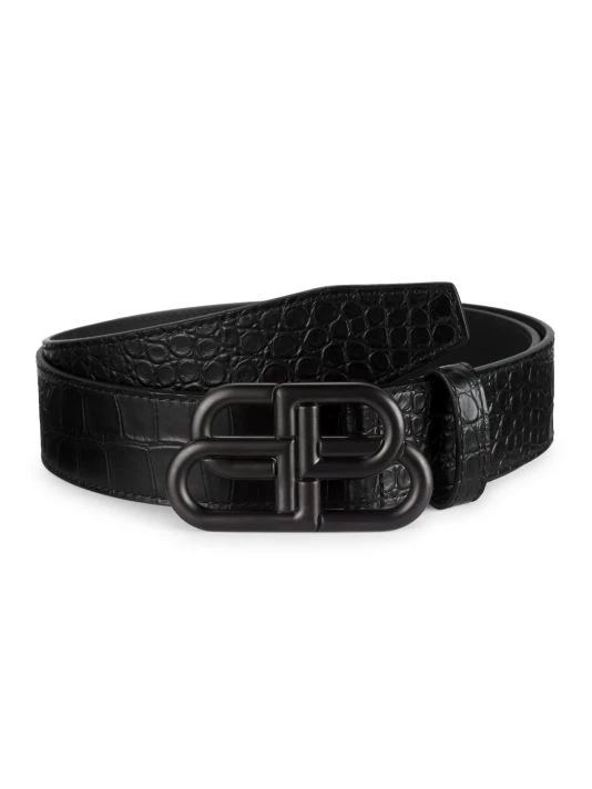 Embossed with a crocodile texture, this luxe leather belt makes a statement with its tonal logo bar design.