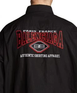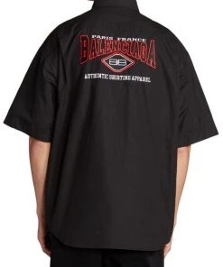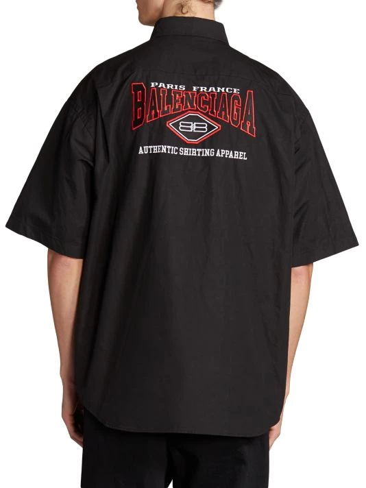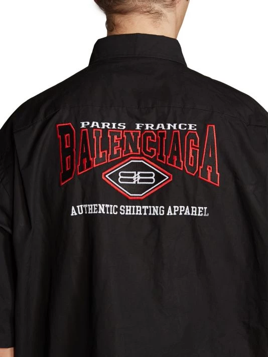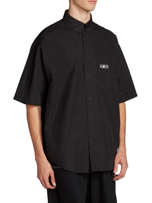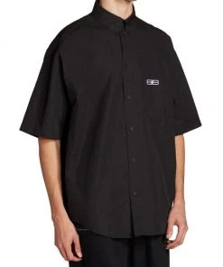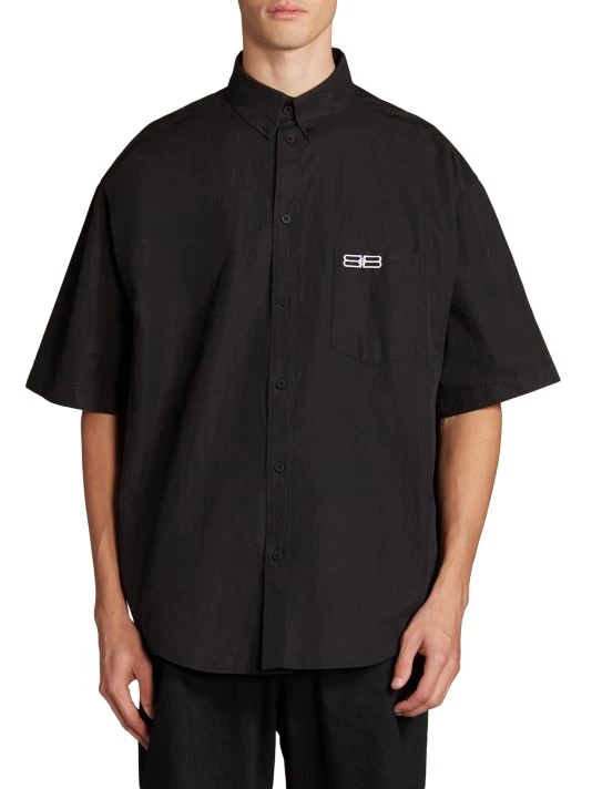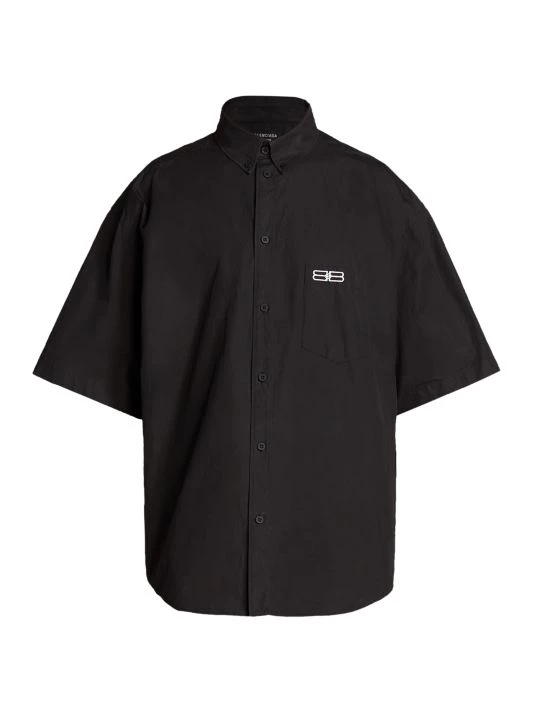 In an absurdist exploration of the line between fashion and entertainment, Balenciaga’s Creative Director Demna juxtaposes boastful glamour with a dystopian edge. Oversized gowns, sequin column dresses, boas, and sleek pleats meet a Y2K, cyber-goth approach to tailoring, baggy denim, and layered knits. This short-sleeved shirt in a drop-shoulder silhouette is embroidered with the logo “BB” on the patch pocket.