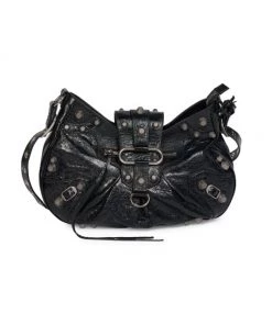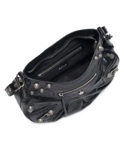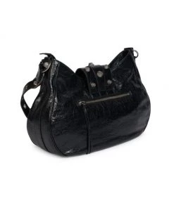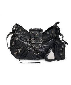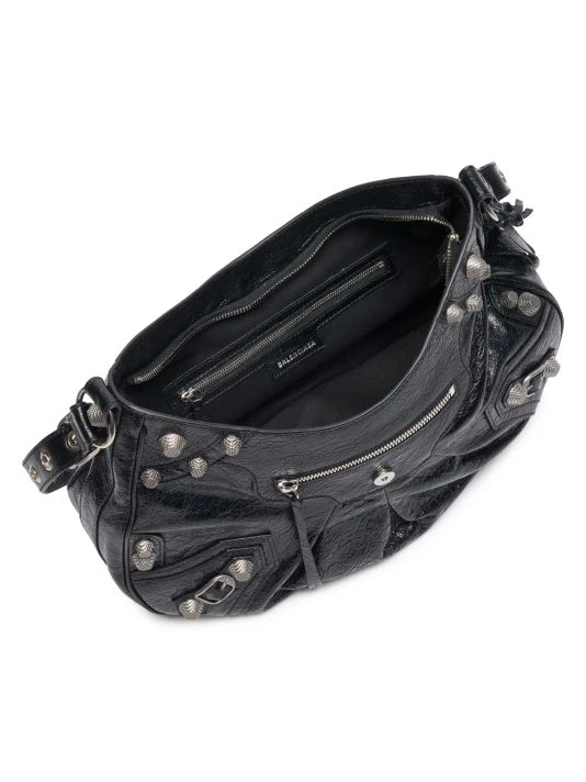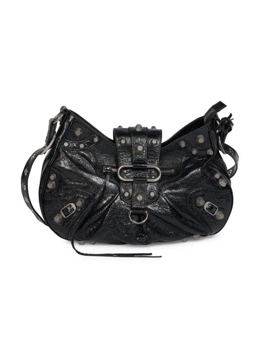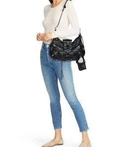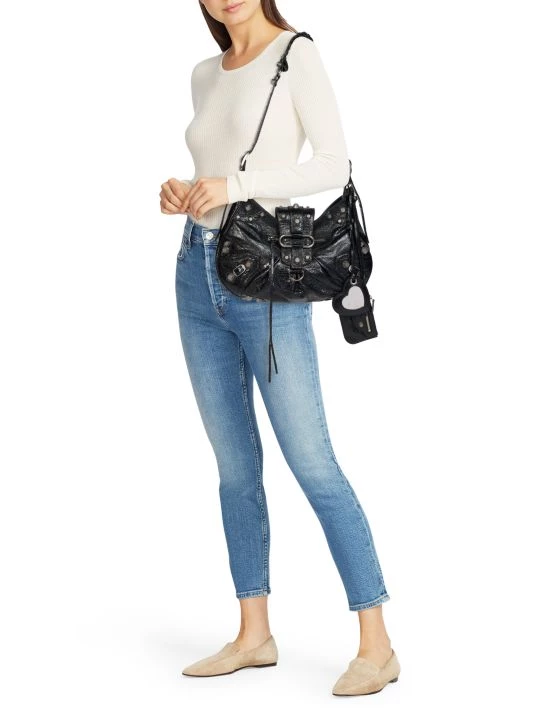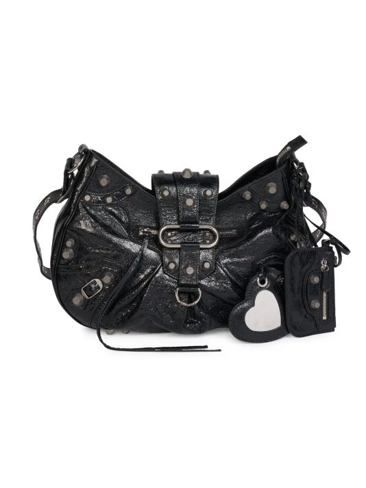 Textured leather with a polished finish creates this hobo bag, flaunting signature studs and two removable bag charms.