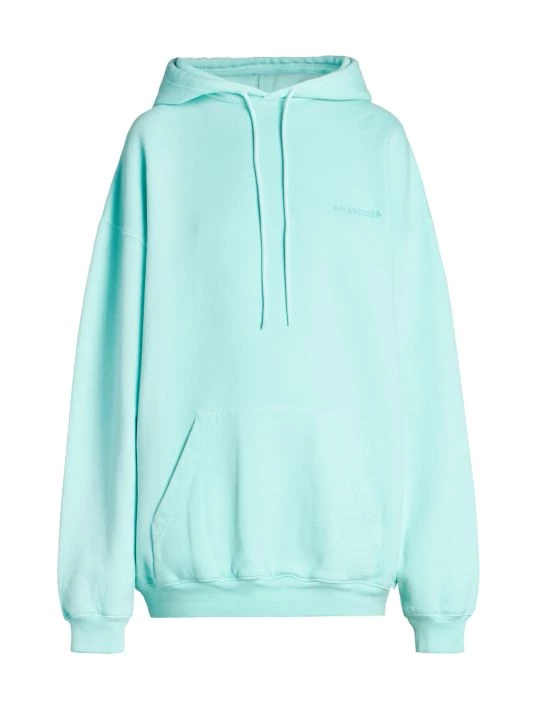 Balenciaga takes on a cyber-glam aesthetic, working lavish details like sequins and boas into baggy, oversized garments. Perfected by Creative Director Demna Gvasalia, this collection encompasses over-the-top platforms, pleated dresses, and strappy studded jeans. Oversized hoodie with tonal logo embroidery at front and back.