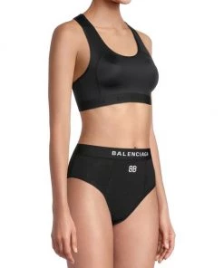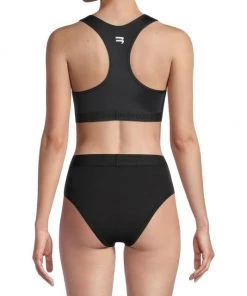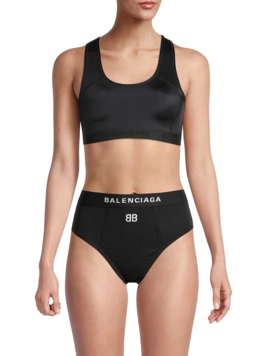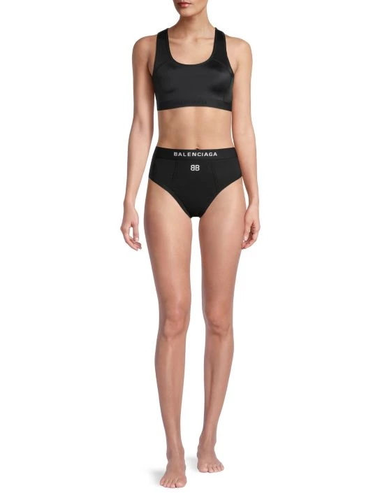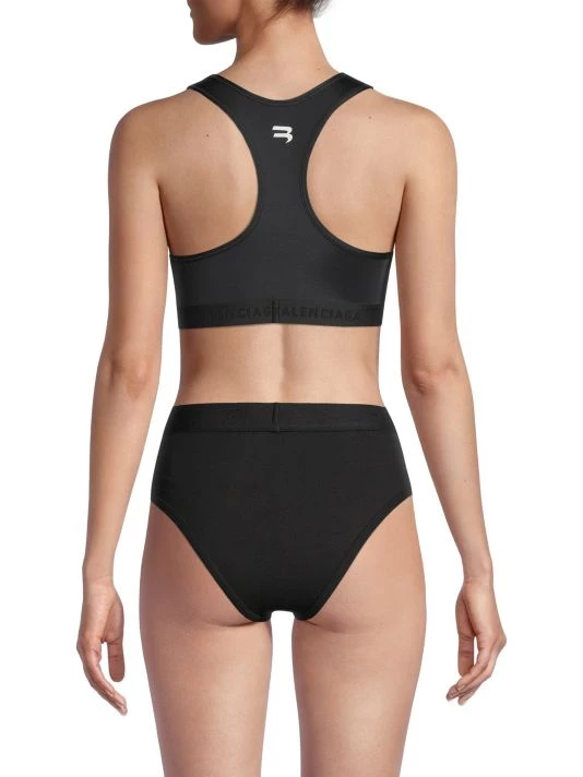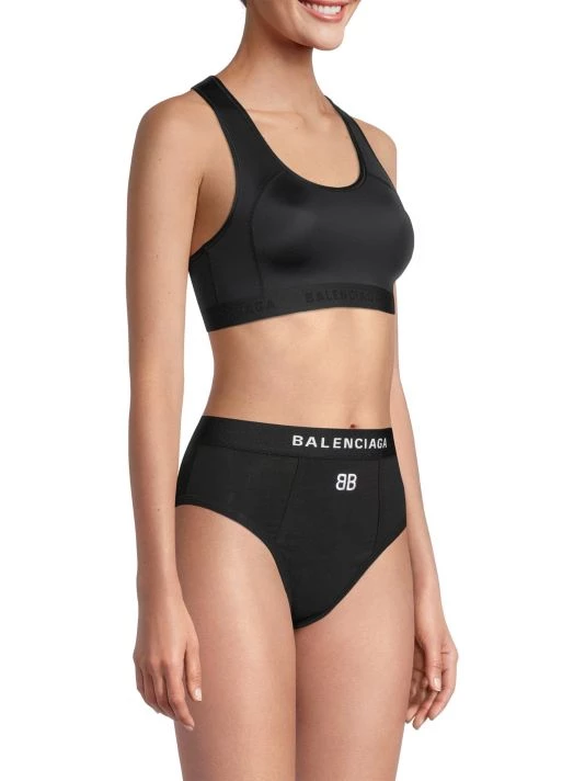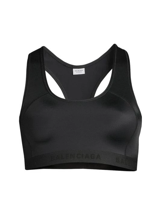 This stretch sports bra features a classic racerback silhouette and branded logo band.