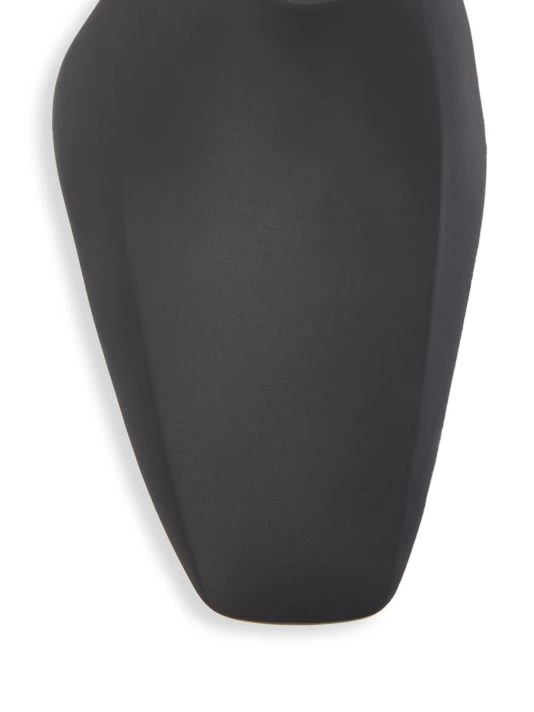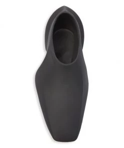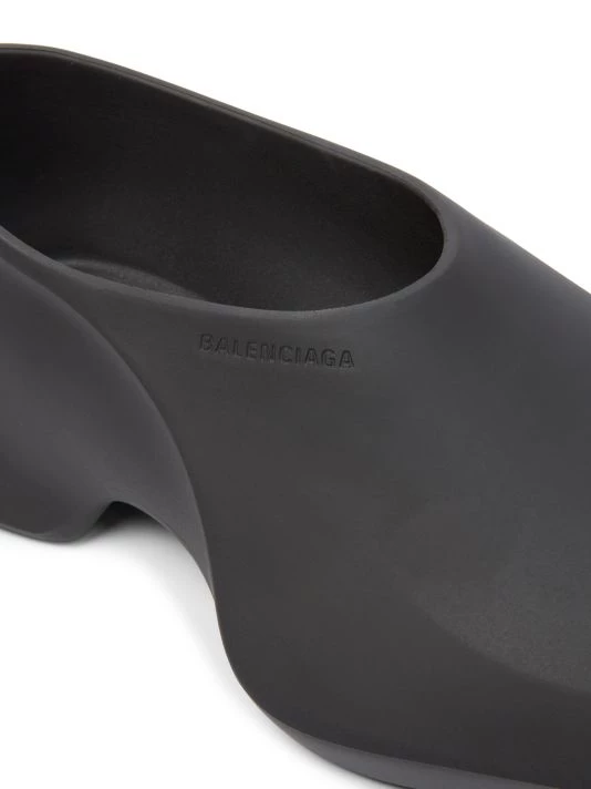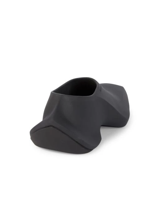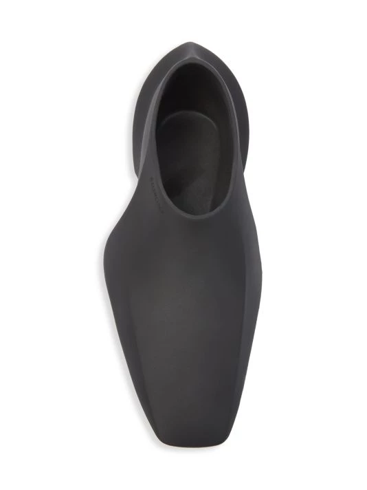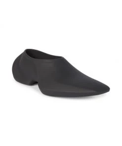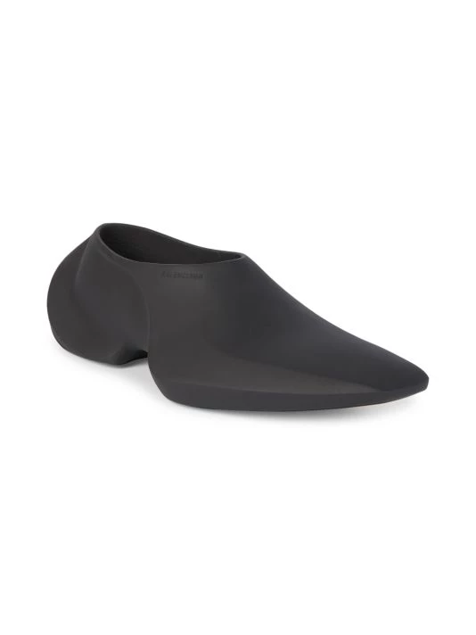 These futuristic slip-on shoes feature a sleek elongated toe with an embossed logo at the foot opening.