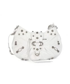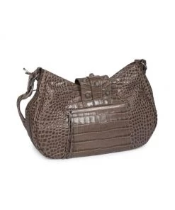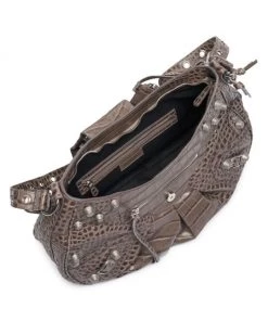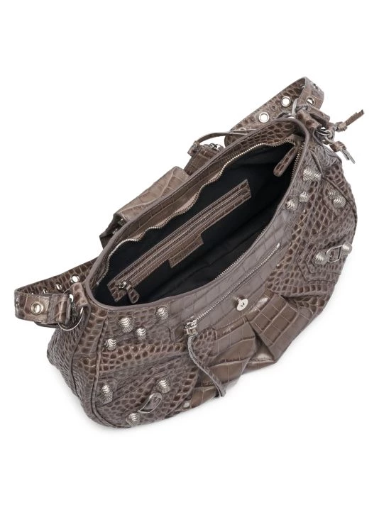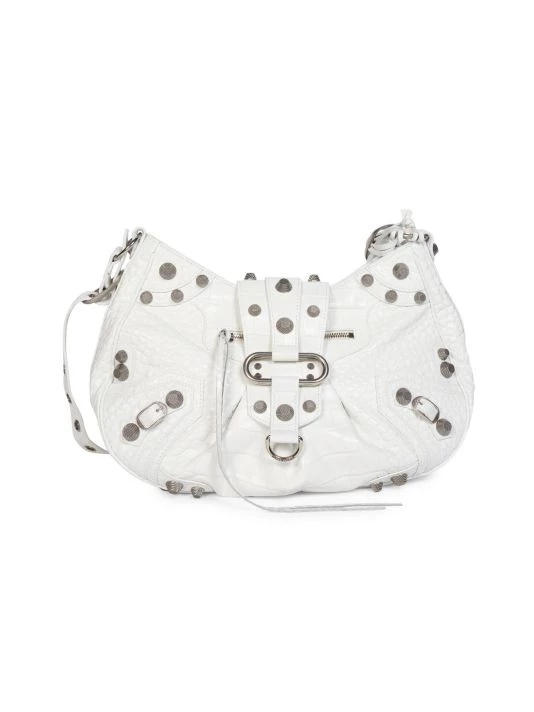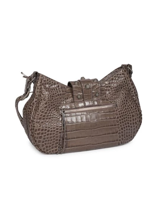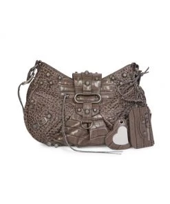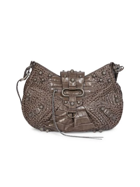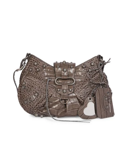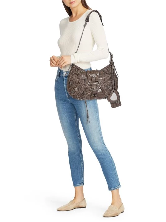 Crocodile-embossed leather creates this hobo bag, flaunting signature studs and two removable bag charms.