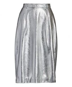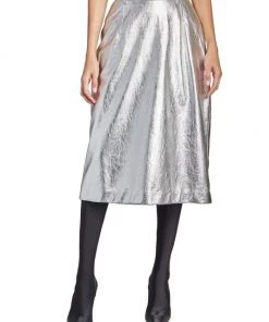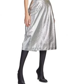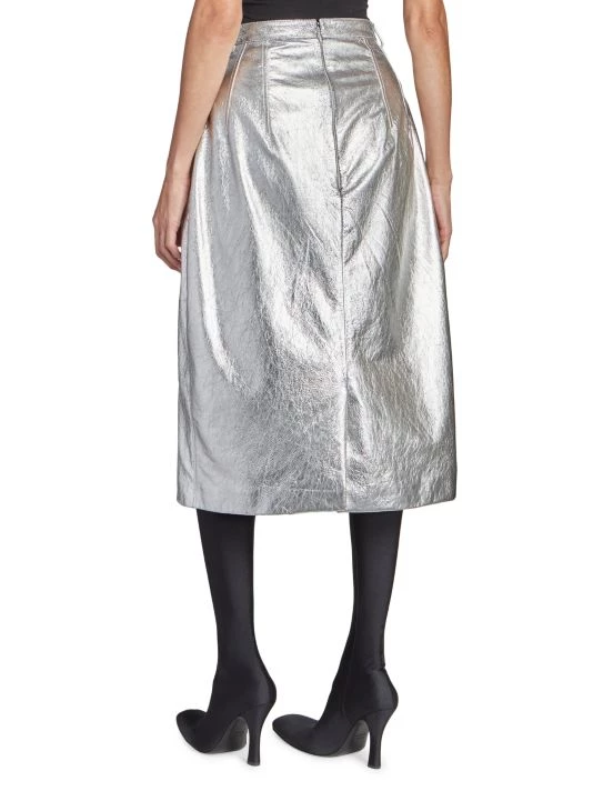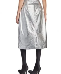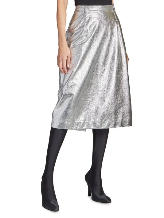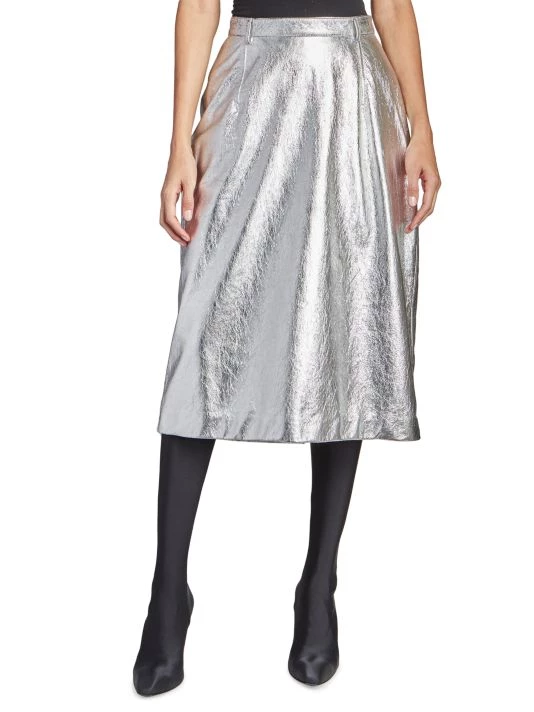 Cut in an A-line silhouette, this midi-skirt is constructed of hammered metallic lambskin leather.