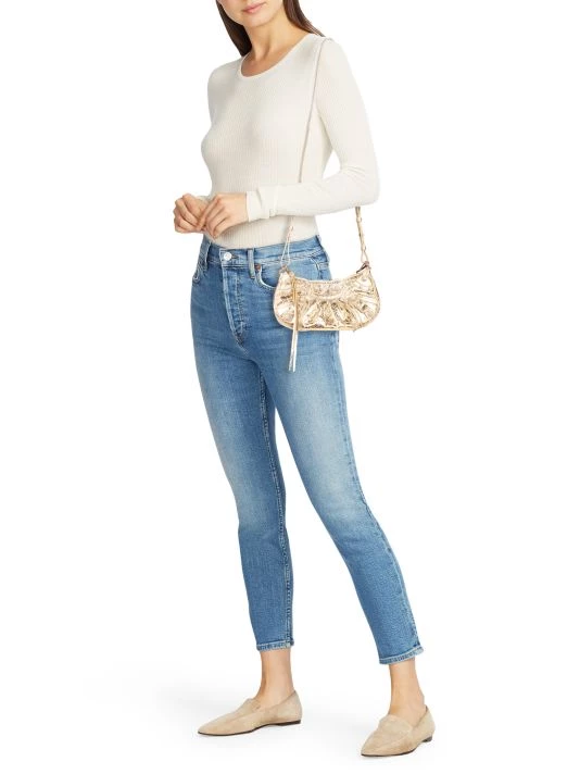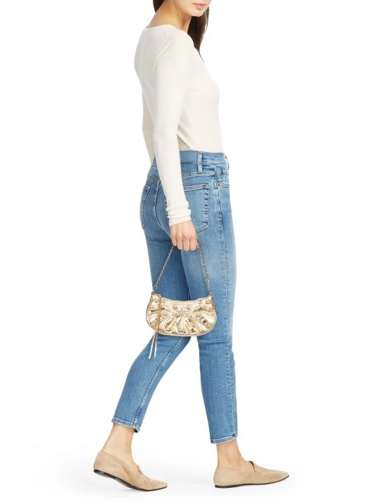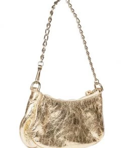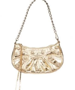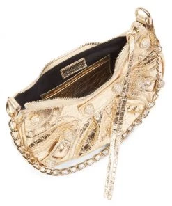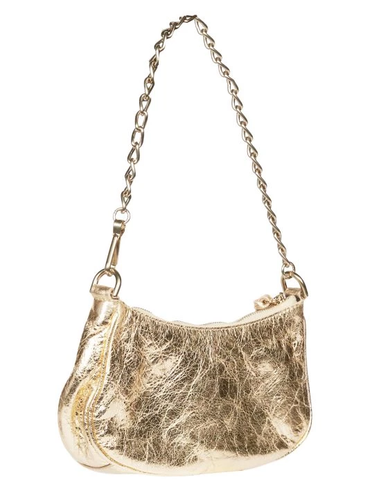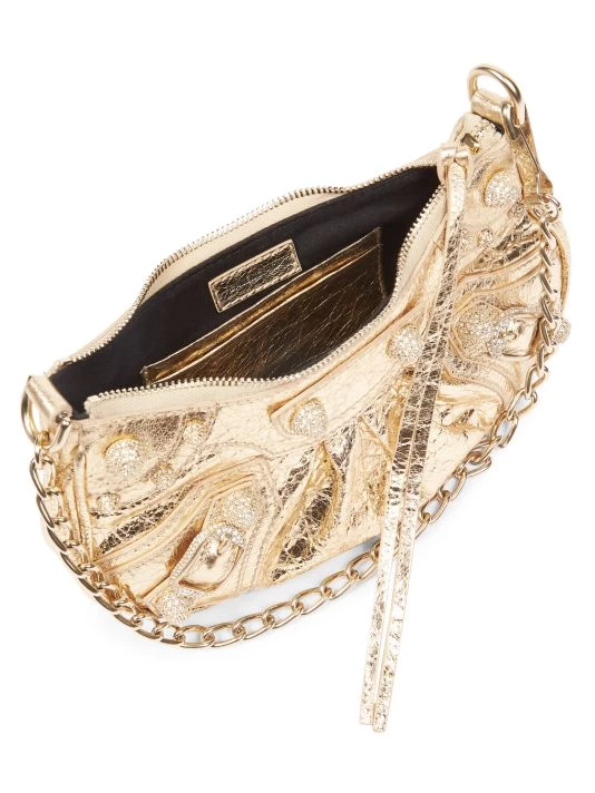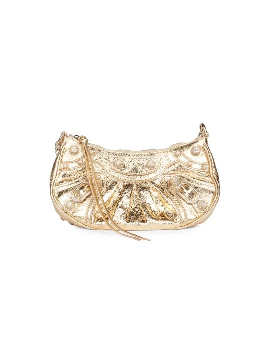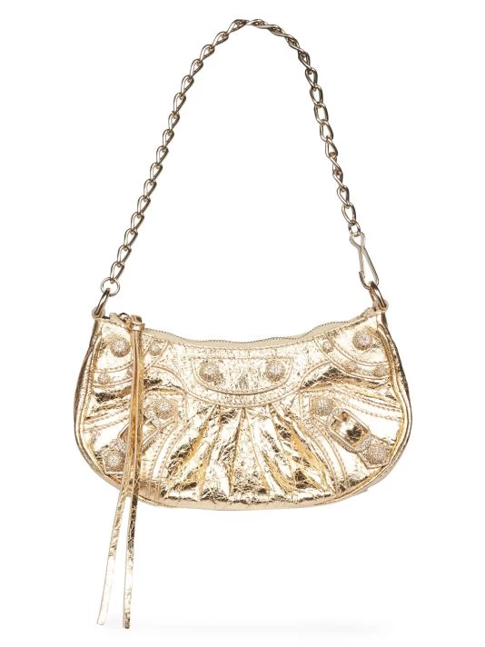 From the Le Cagole Collection. Made in Italy of crinkled metallic leather, Balenciaga’s shoulder bag features long knotted zipper pulls and signature studs. This luxurious piece is accompanied by a chain handle and adjustable shoulder strap.