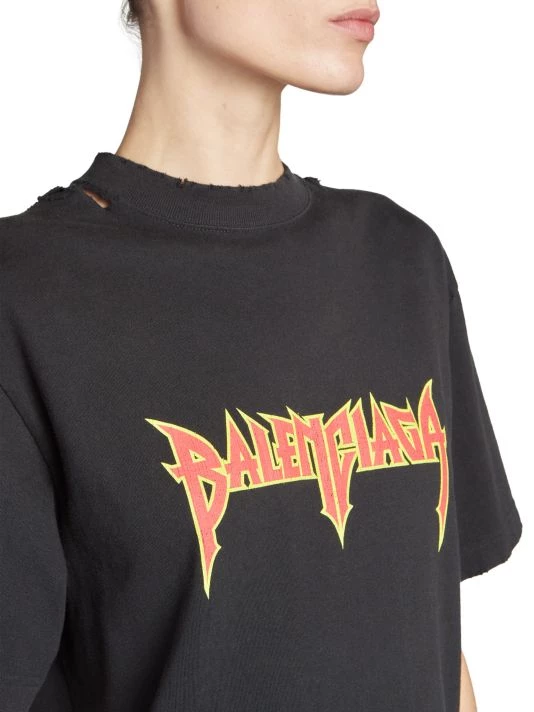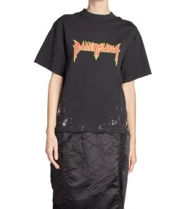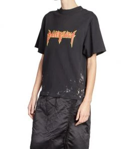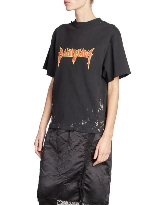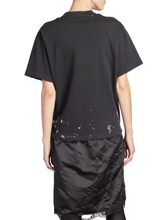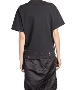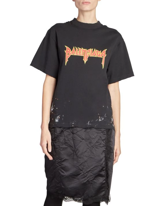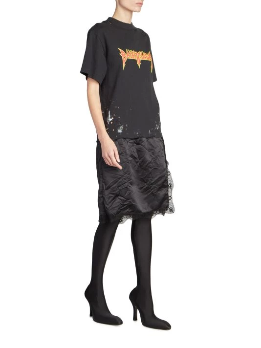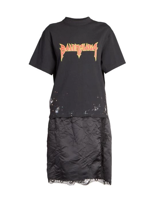 This layered mixed media dress offers a logo T-shirt bodice and hammered lace-trimed skirt.
