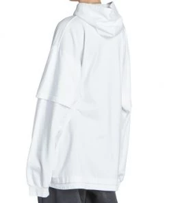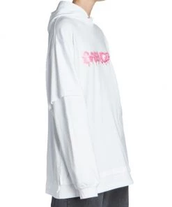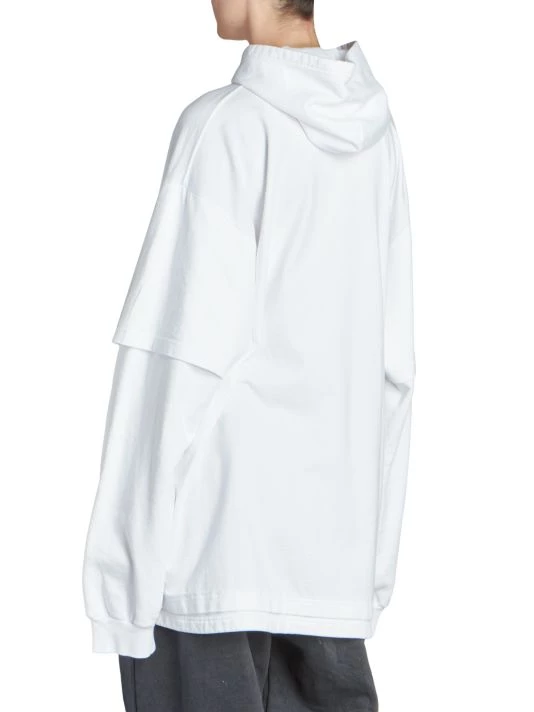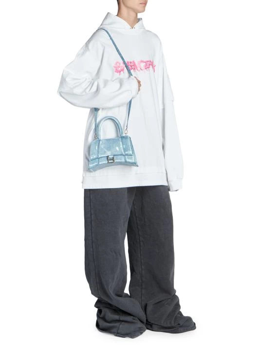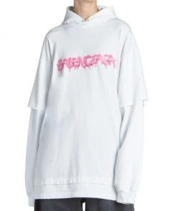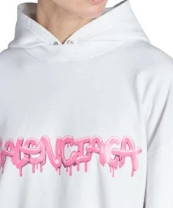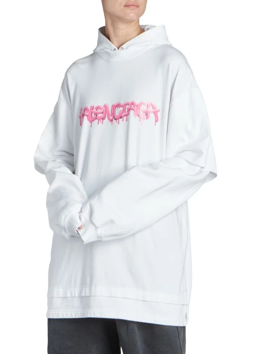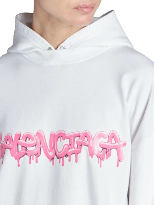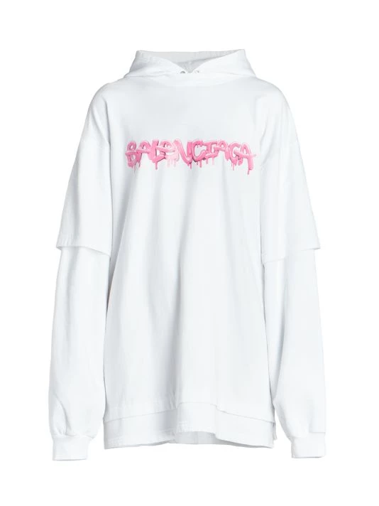 Balenciaga takes on a cyber-glam aesthetic, working lavish details like sequins and boas into baggy, oversized garments. Perfected by Creative Director Demna Gvasalia, this collection encompasses over-the-top platforms, pleated dresses, and strappy studded jeans. Oversized hoodie with a mock layered silhouette and large graffiti print logo at chest.