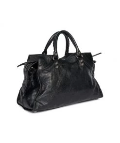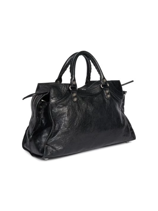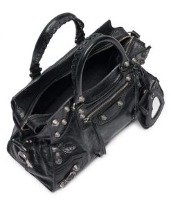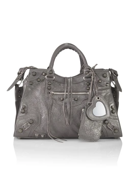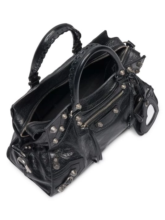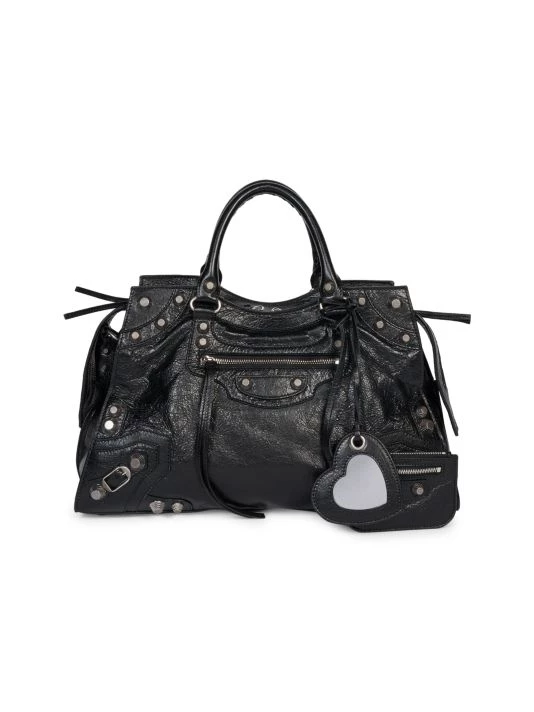 A reinvented classic, Balenciaga’s Neo Cagole City satchel is crafted of rich textured leather punctuated with signature studs and long knotted zipper pulls. This luxurious piece is detailed with a cardholder and heart-shaped compact mirror.