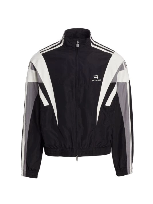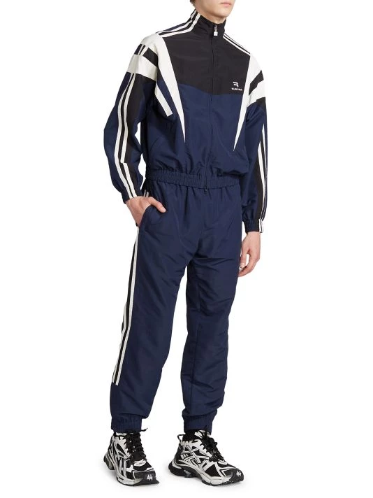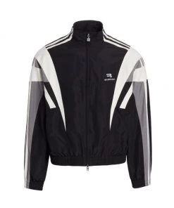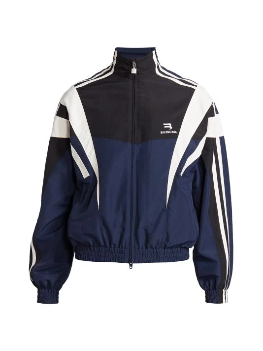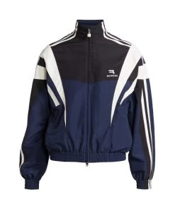 Balenciaga takes on a cyber-glam aesthetic, working lavish details like sequins and boas into baggy, oversized garments. Perfected by Creative Director Demna Gvasalia, this collection encompasses over-the-top platforms, pleated dresses, and strappy studded jeans. This traditional tracksuit jacket fastens with a zip-front closure, and is finished with a mockneck and side slip pockets.