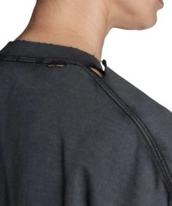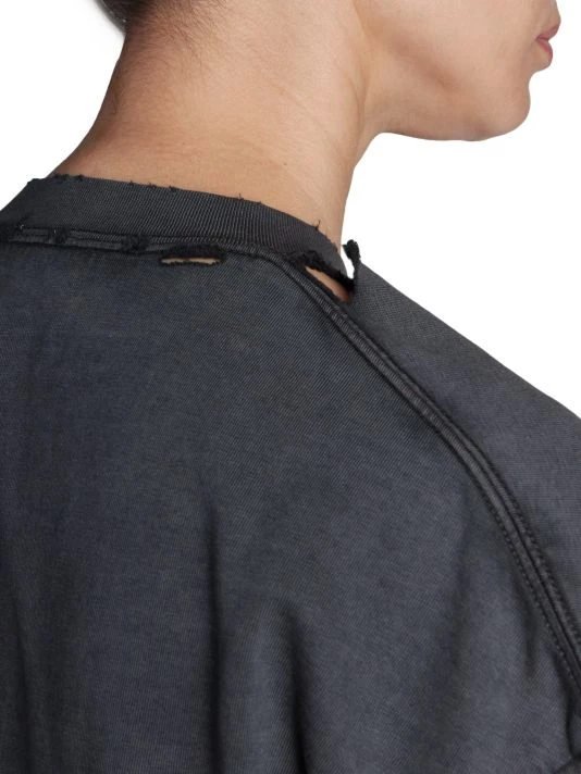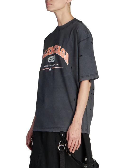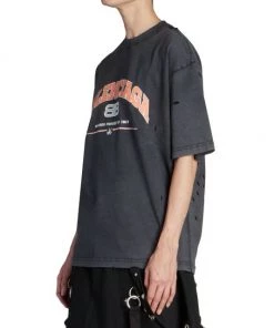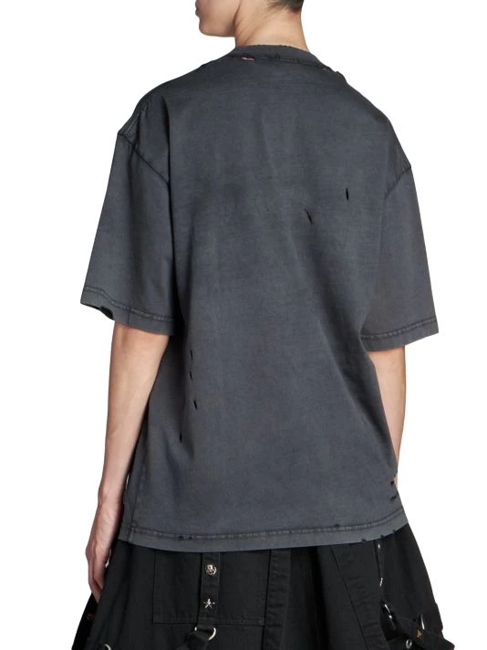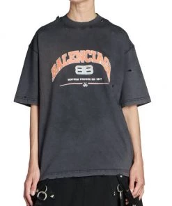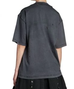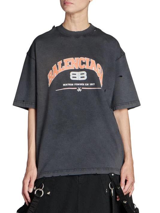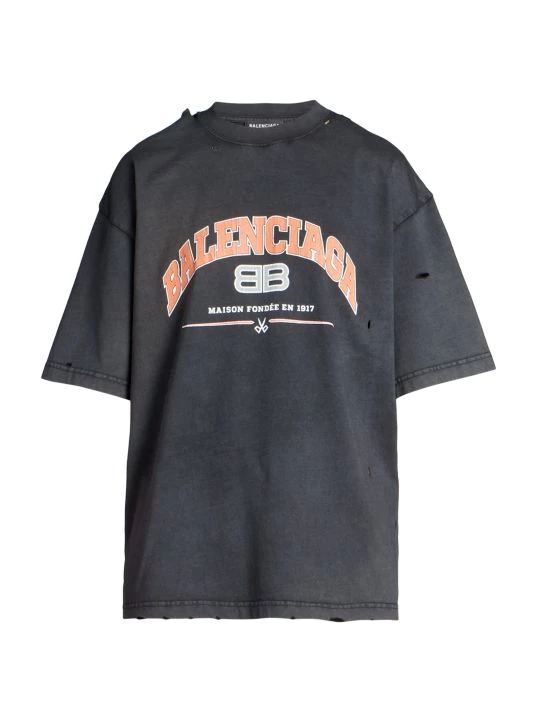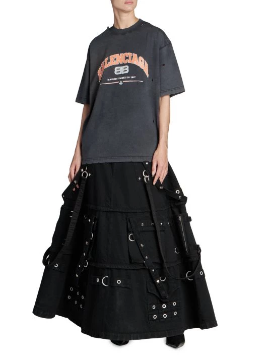 Balenciaga takes on a cyber-glam aesthetic, working lavish details like sequins and boas into baggy, oversized garments. Perfected by Creative Director Demna Gvasalia, this collection encompasses over-the-top platforms, pleated dresses, and strappy studded jeans. Boxy oversized T-shirt with large logo graphic at chest and scattered distressing throughout for a worn-in look.