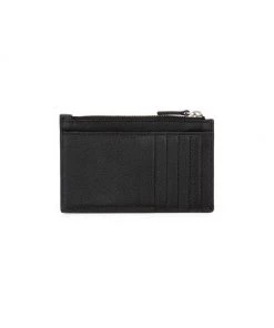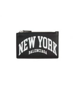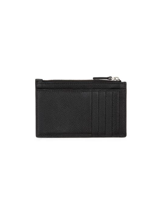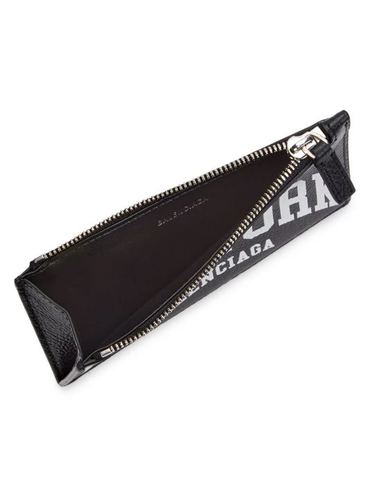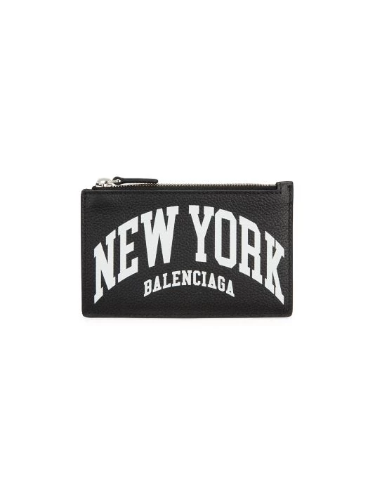 Oversized text graphics and logo branding enhance the front of this leather cardholder.