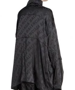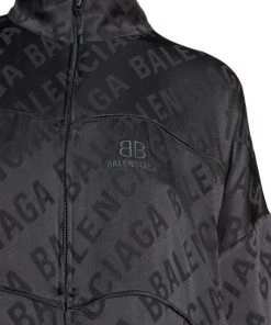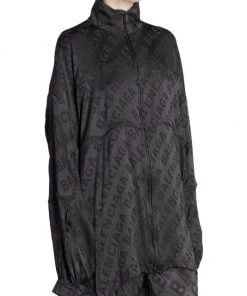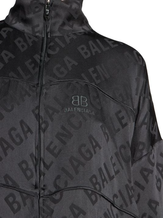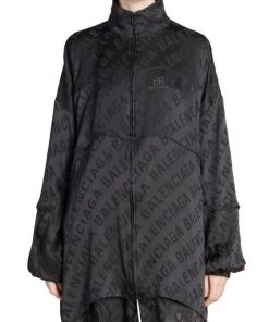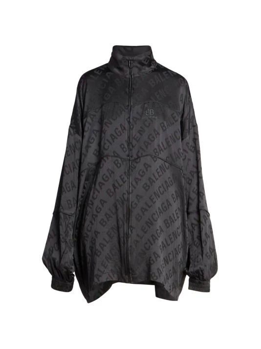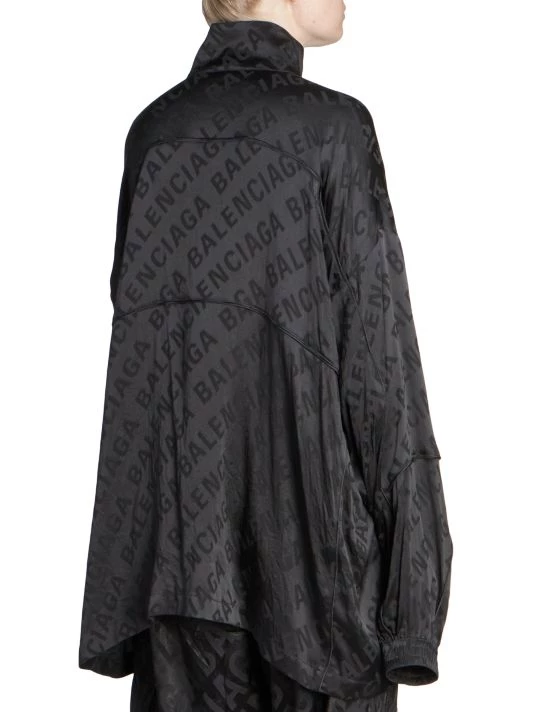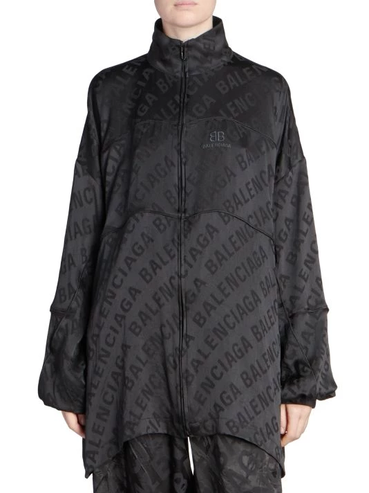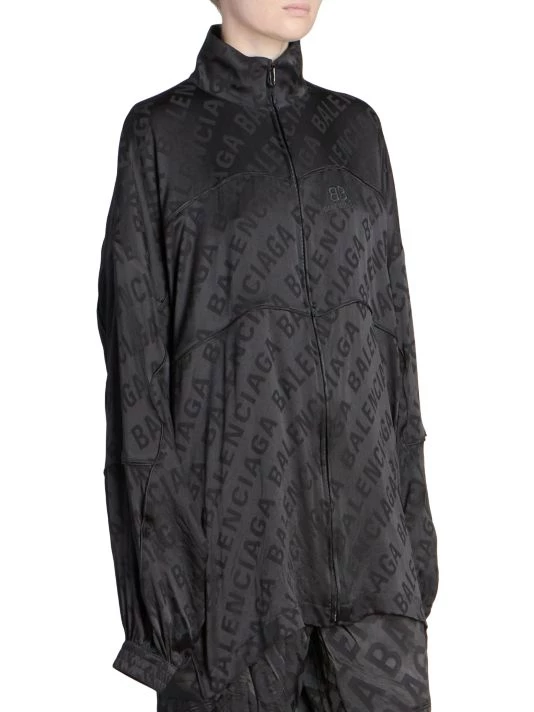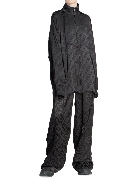 Balenciaga takes on a cyber-glam aesthetic, working lavish details like sequins and boas into baggy, oversized garments. Perfected by Creative Director Demna Gvasalia, this collection encompasses over-the-top platforms, pleated dresses, and strappy studded jeans. Oversized track jacket with micro embroidered logo at chest and allover tonal horizontal branding.