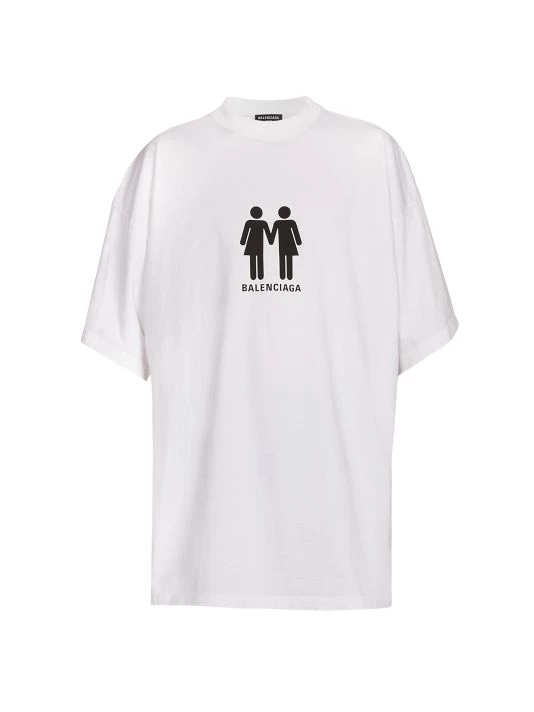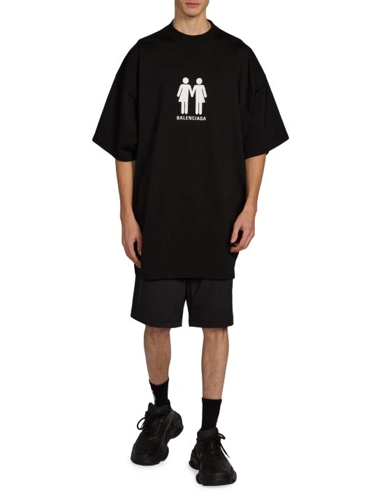 Cut for an oversized fit, this T-shirt features an all-gender bathroom symbol on the front and twenty-four Pride flags on the back.
