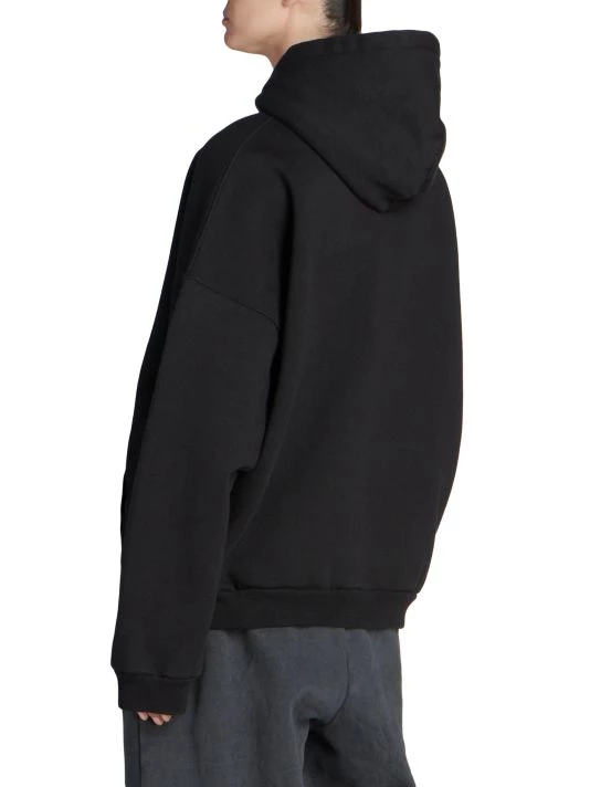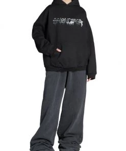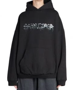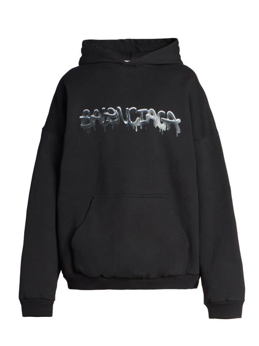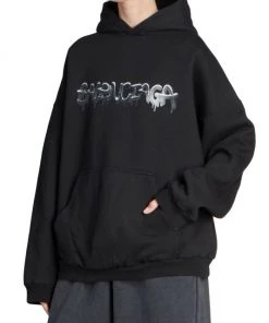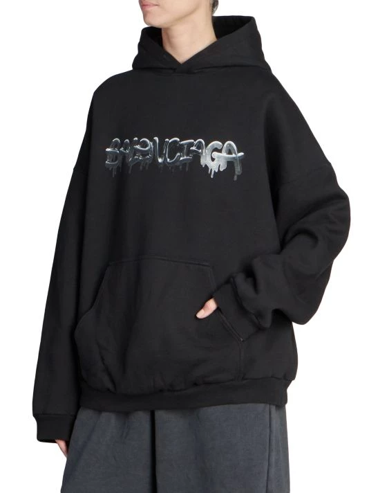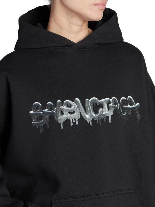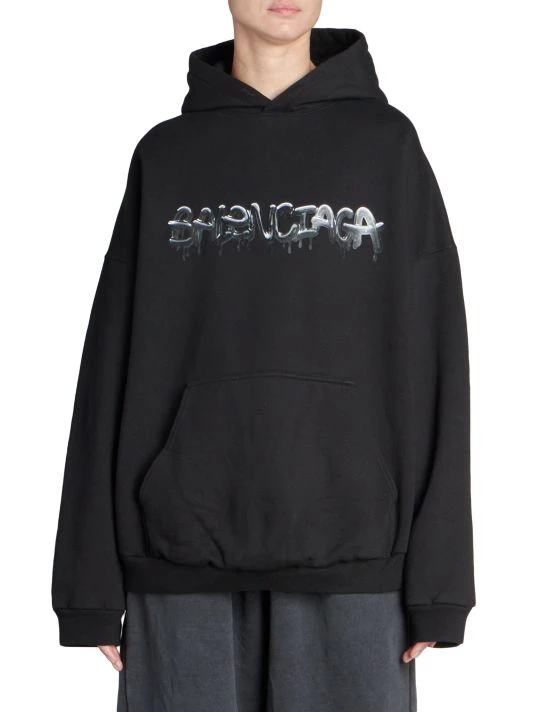 Balenciaga takes on a cyber-glam aesthetic, working lavish details like sequins and boas into baggy, oversized garments. Perfected by Creative Director Demna Gvasalia, this collection encompasses over-the-top platforms, pleated dresses, and strappy studded jeans. Oversized hoodie with large dripping spray paint-inspired logo at chest.