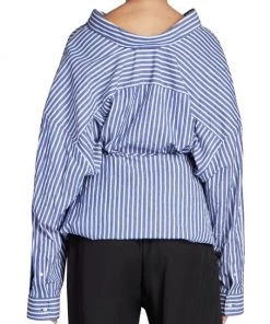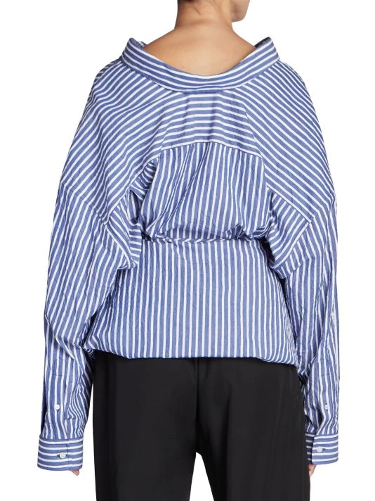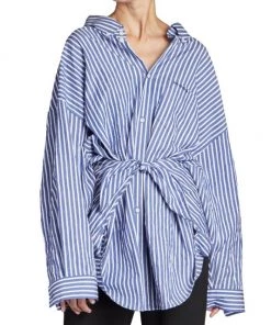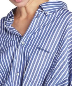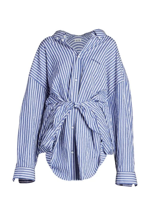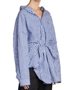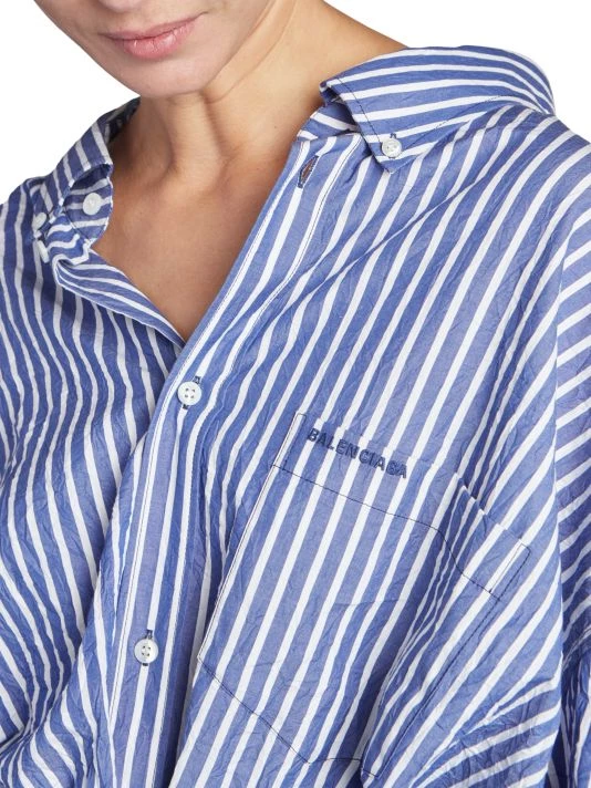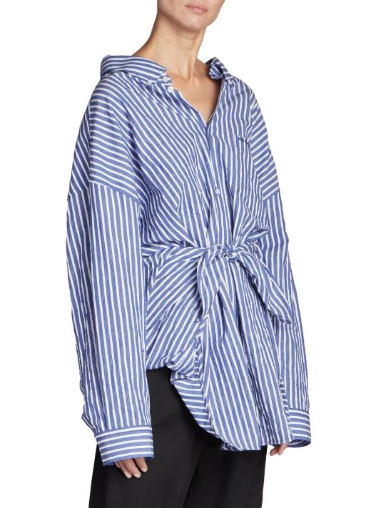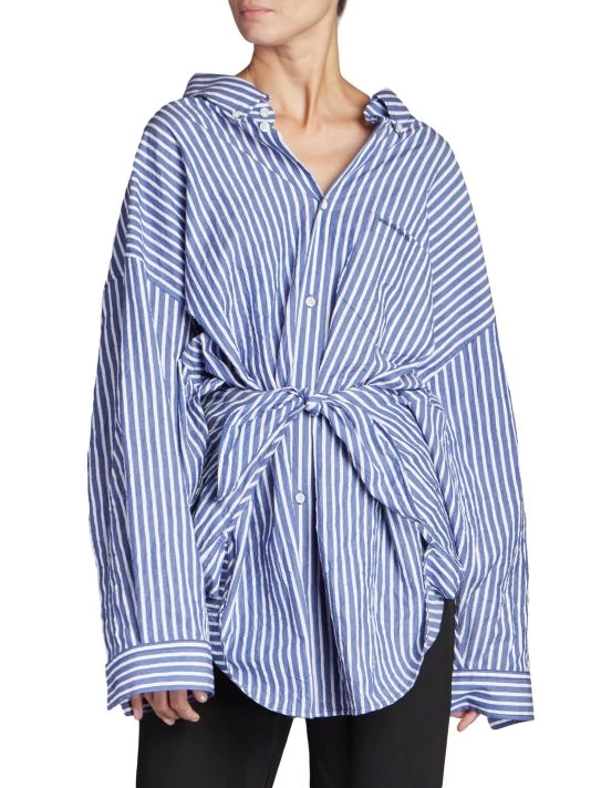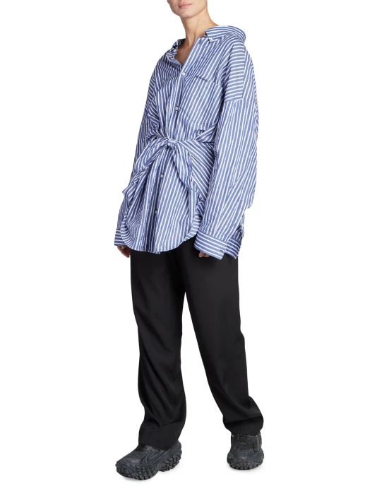 Cut in an oversized silhouette, Balenciaga’s button-down shirt is enhanced by a knotted front. A solid micro logo at the chest patch pocket contrasts the style’s vertical striping.