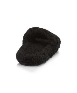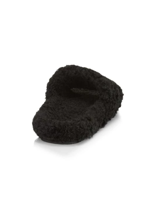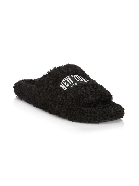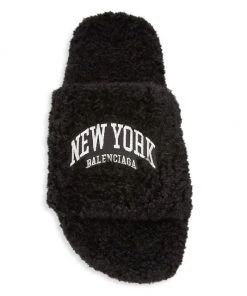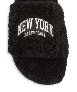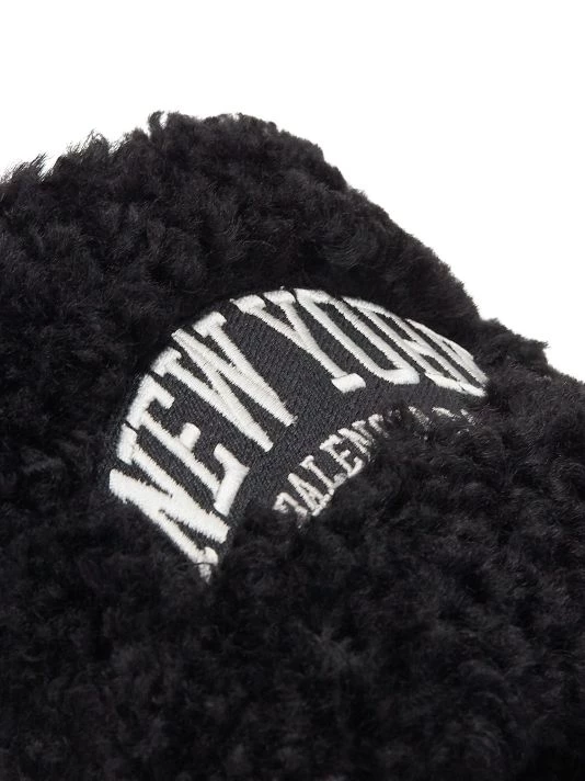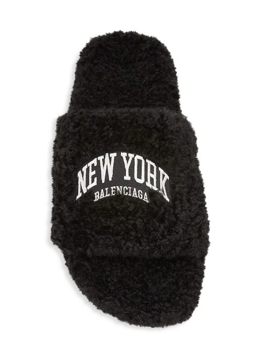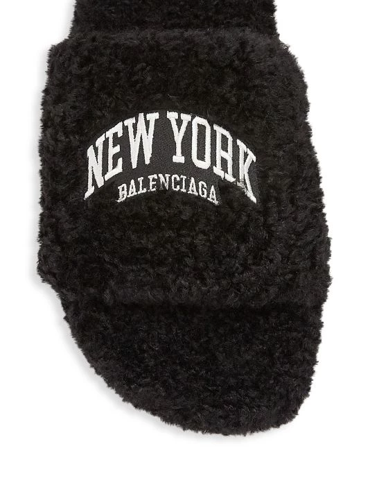 In an absurdist exploration of the line between fashion and entertainment, Balenciaga’s Creative Director Demna juxtaposes boastful glamour with a dystopian edge. Oversized gowns, sequin column dresses, boas, and sleek pleats meet a Y2K, cyber-goth approach to tailoring, baggy denim, and layered knits. Crafted in Italy, these slip-on slides in a faux shearling finish are embroidered with the city of Paris across the vamp.