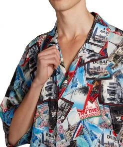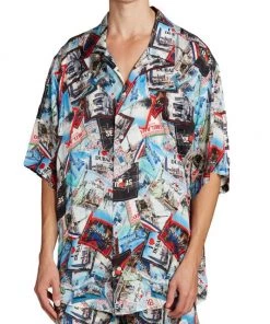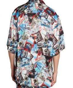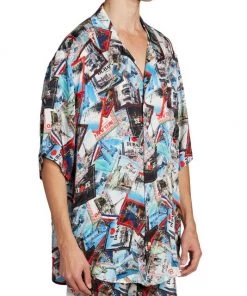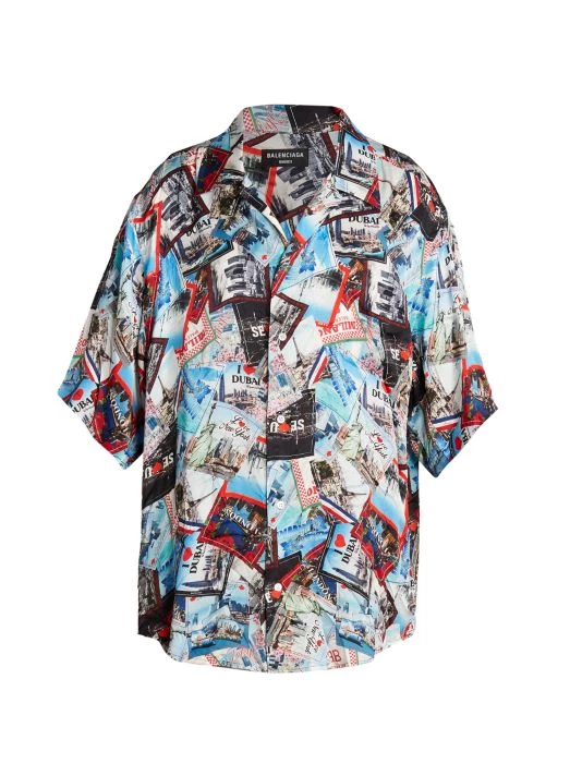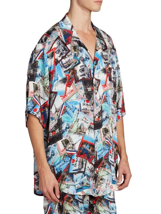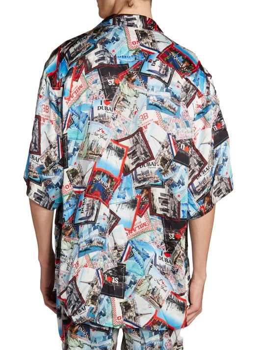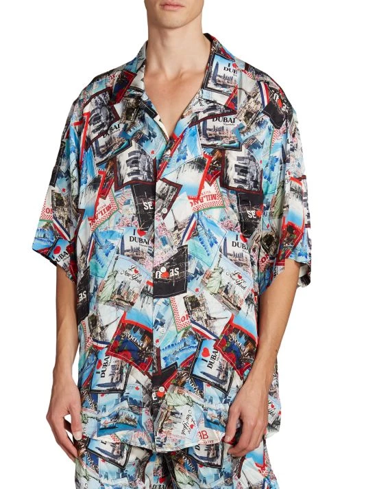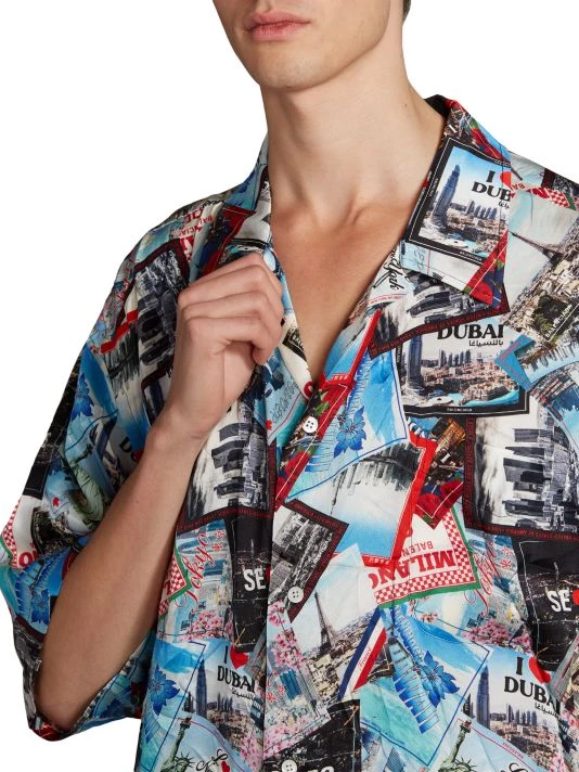 Crafted of lustrous silk for an oversized fit, this pajama shirt showcases a travel-inspired luggage sticker print featuring multiple cities from around the world.