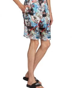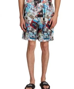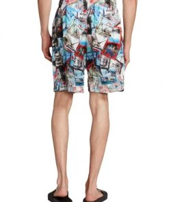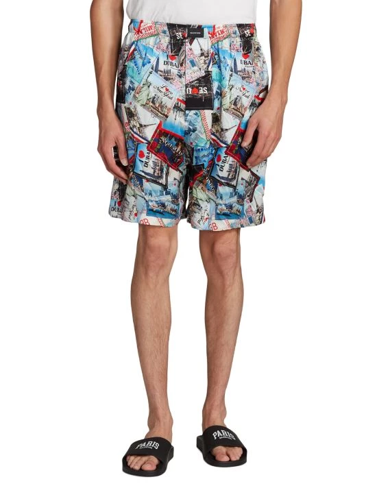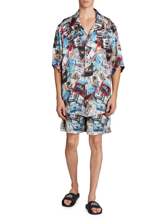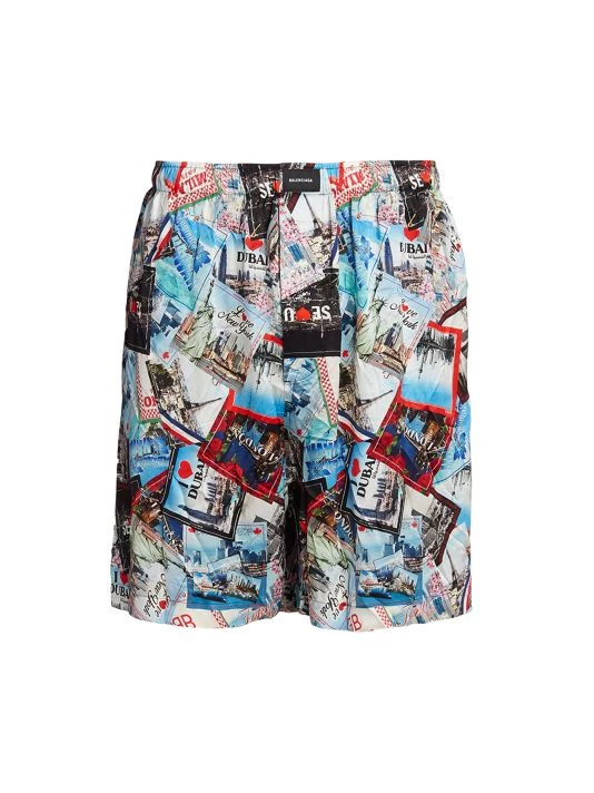 Crafted of lustrous silk, these pajama shorts showcase a travel-inspired luggage sticker print featuring multiple cities from around the world.