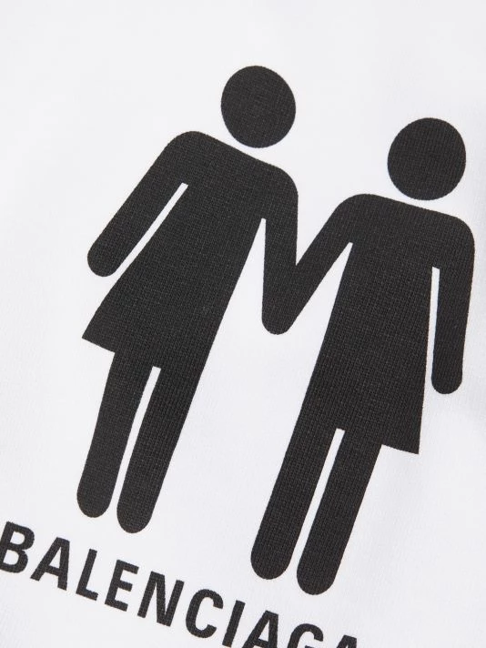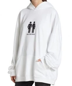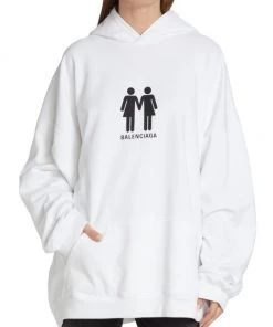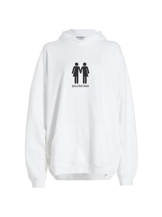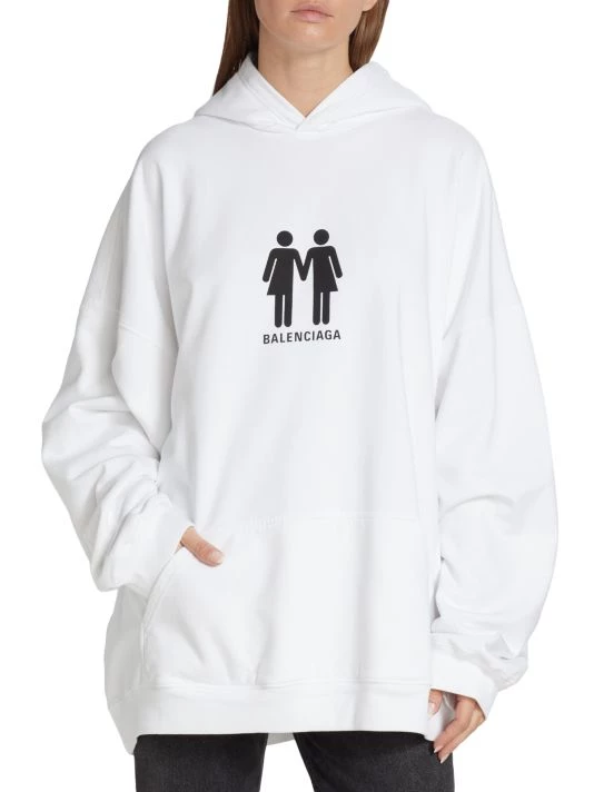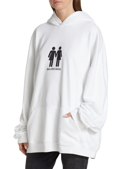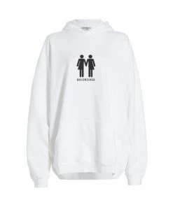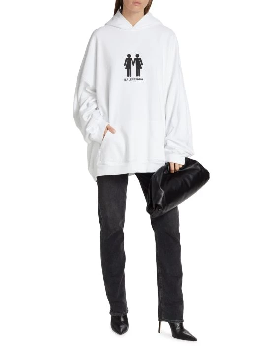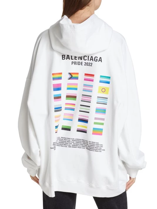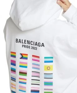 Balenciaga celebrates Pride with this boxy oversized hoodie. Featuring the flags of Queer groups on the back of the garment, this style evokes a powerful statement of equality.