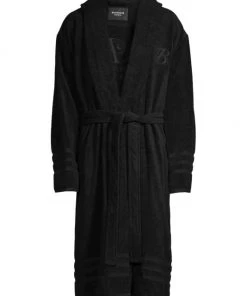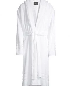 Cozy towel bathrobe with self-tie waist, finished with embroidered resort motif.