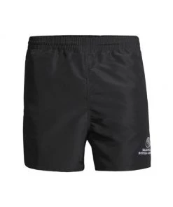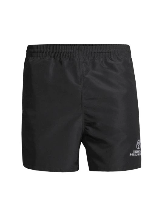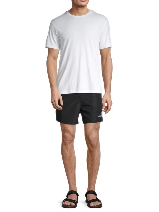 These elastic waistband swim trunks feature a striped pattern that incorporates the brand’s logo.