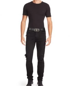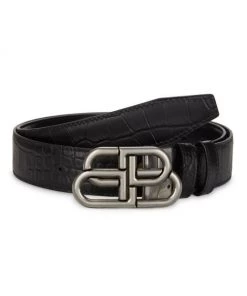 This Balenciaga belt reverses from smooth to croc-embossed leather and features a silvertone interlocking logo buckle.