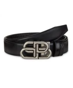 This Balenciaga belt reverses from smooth to croc-embossed leather and features a silvertone interlocking logo buckle.