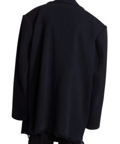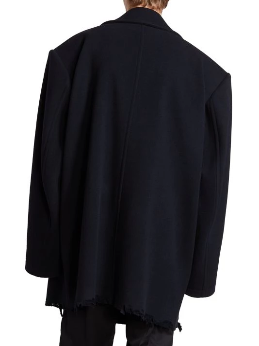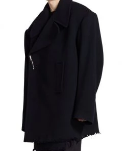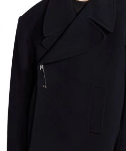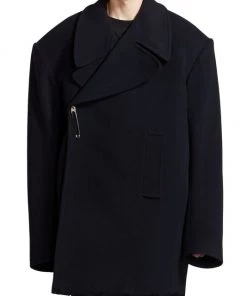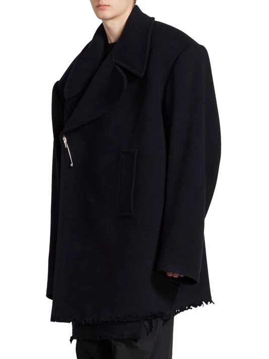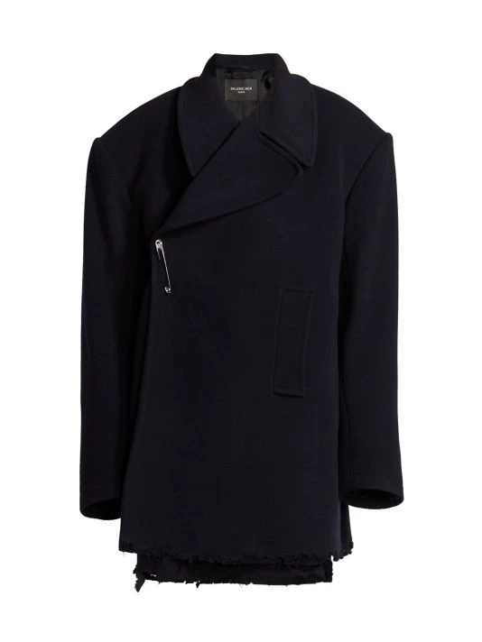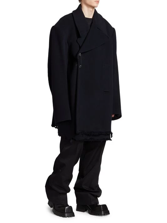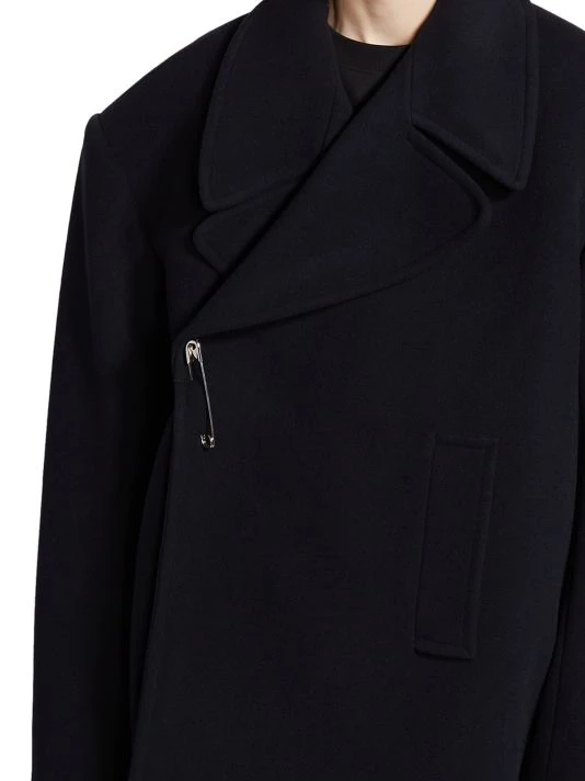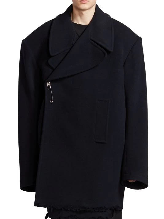 Balenciaga takes on a cyber-glam aesthetic, working lavish details like sequins and boas into baggy, oversized garments. Perfected by Creative Director Demna Gvasalia, this collection encompasses over-the-top platforms, pleated dresses, and strappy studded jeans. This oversized peacoat features a safety pin closure and side slip pockets.