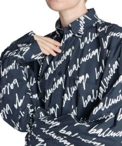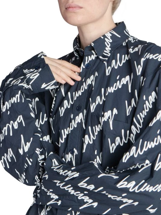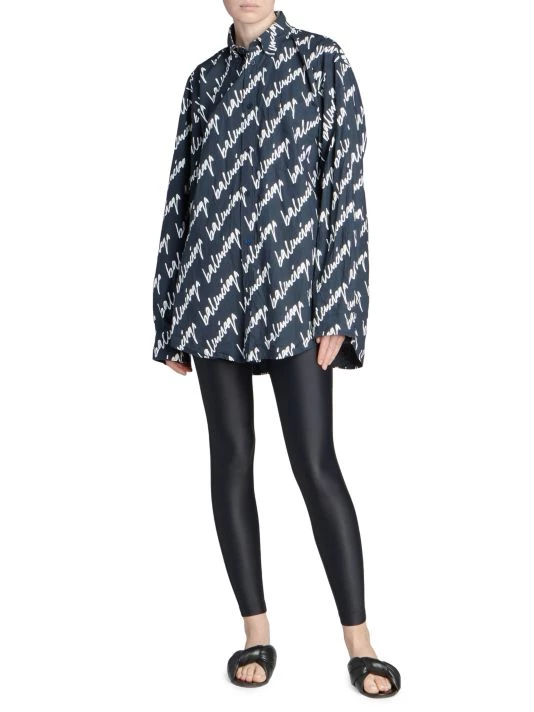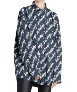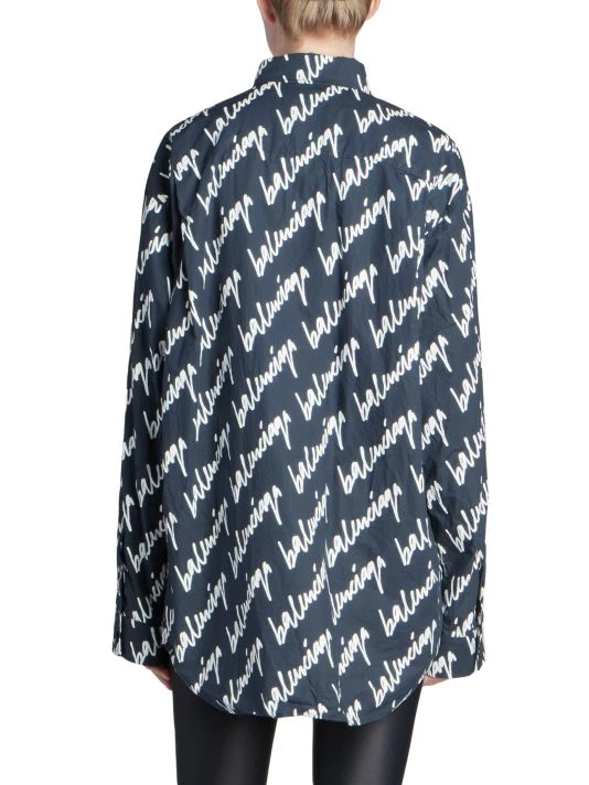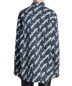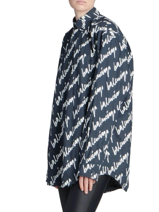 Balenciaga takes on a cyber-glam aesthetic, working lavish details like sequins and boas into baggy, oversized garments. Perfected by Creative Director Demna Gvasalia, this collection encompasses over-the-top platforms, pleated dresses, and strappy studded jeans. Oversized button down shirt with large contrast scribble branding.