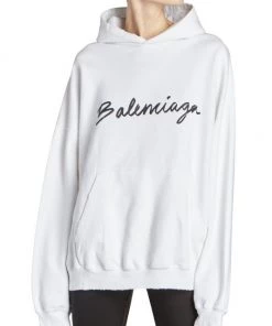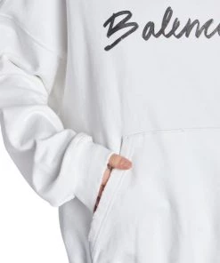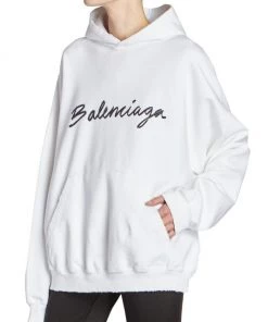This classic pullover hoodie from Balenciaga showcases an oversized fit. Crafted of cotton, this style features a statement script logo at the chest.